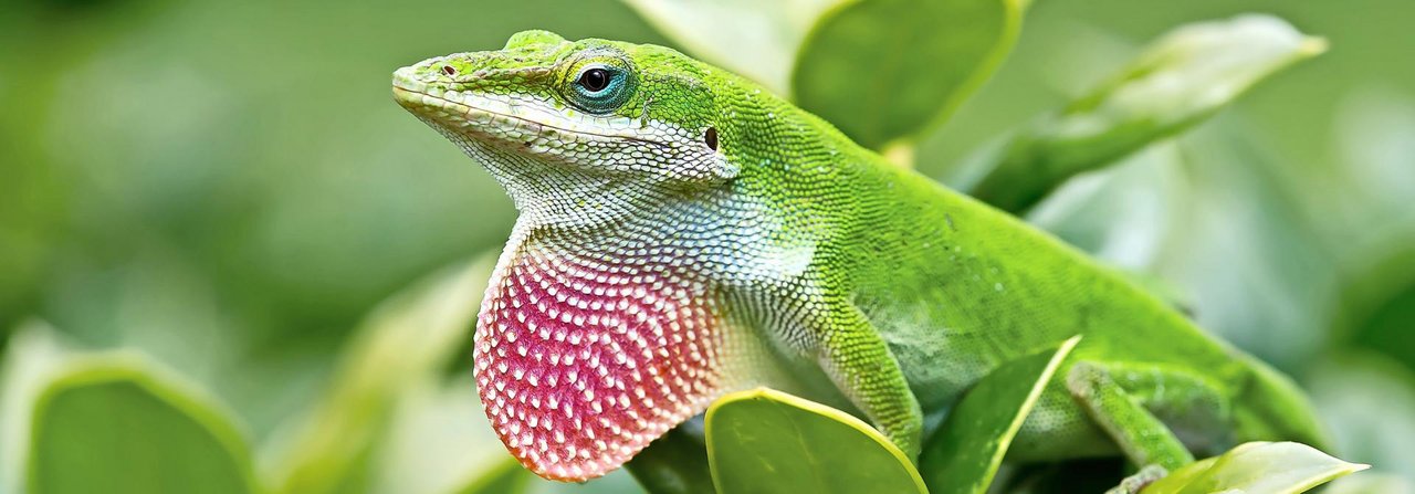 Der Rotkehlanolis aus den Subtropen der USA und der Karibik sieht aus wie eine kleine, grüne Eidechse. Er eignet sich gut für Waldterrarien oder Paludarien, die einen Land- und Wasserteil aufweisen. Rotkehl-anolis leben in Gruppen und unterhalten eine Rangordnung. Ein Männchen kann mit mehreren Weibchen gehalten werden. Die Luftfeuchtigkeit sollte abends mittels Sprühen von 65 auf bis zu 90 Prozent erhöht werden. Fliegen, Maden, Mehlwürmer und Grillen gehören zur Nahrung der Anolis, die ihre Färbung zwischen braun und grün wechseln können. Äste und zahlreiche Pflanzen dienen den Anolis als Kletter- und Aufenthaltsmöglichkeiten.