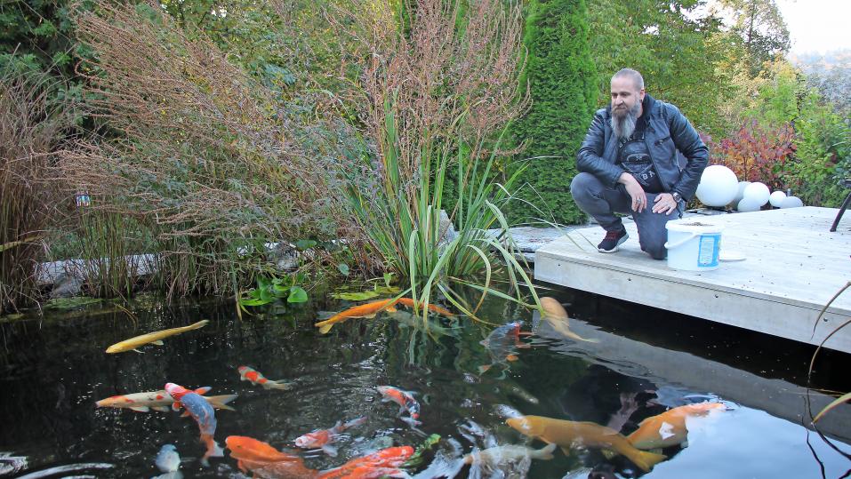 Fische sind besonders heikle Heimtiere: «Wenn die Wasserqualität nicht stimmt, leiden sie.» Für Kois sei mittelhartes Wasser ideal. Wasserwechsel mache er nie, sondern fülle nur zu. Er brauche es nicht zu heizen. «Werden die Wassertemperaturen kühler, sind die Kois weniger aktiv.» Der Teich würde aber nie zufrieren. Im Winter schwämmen sie häufig am Grund. Er variiere mit Sommer- und Winterfutter. Letzteres sänke auf den Grund.
