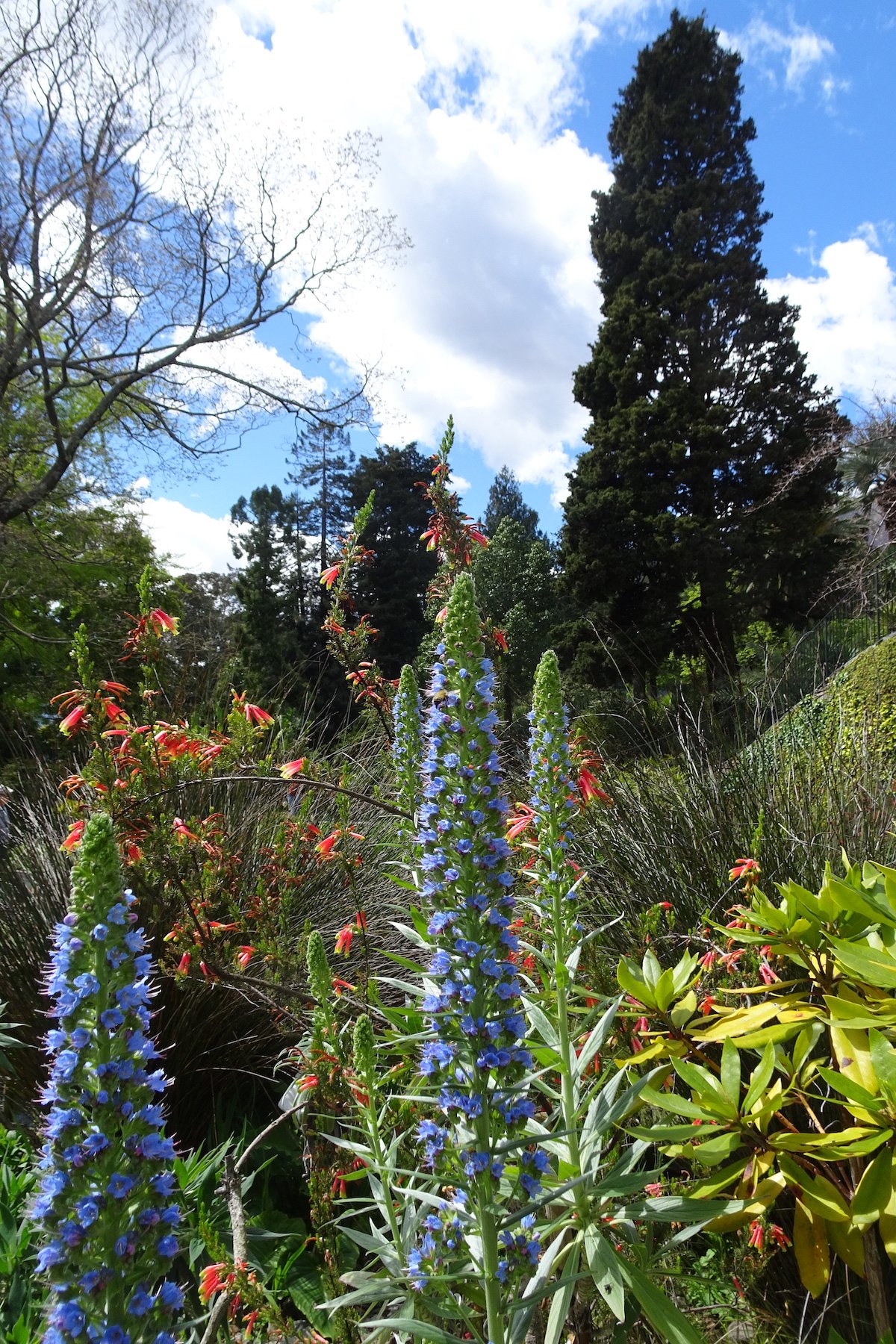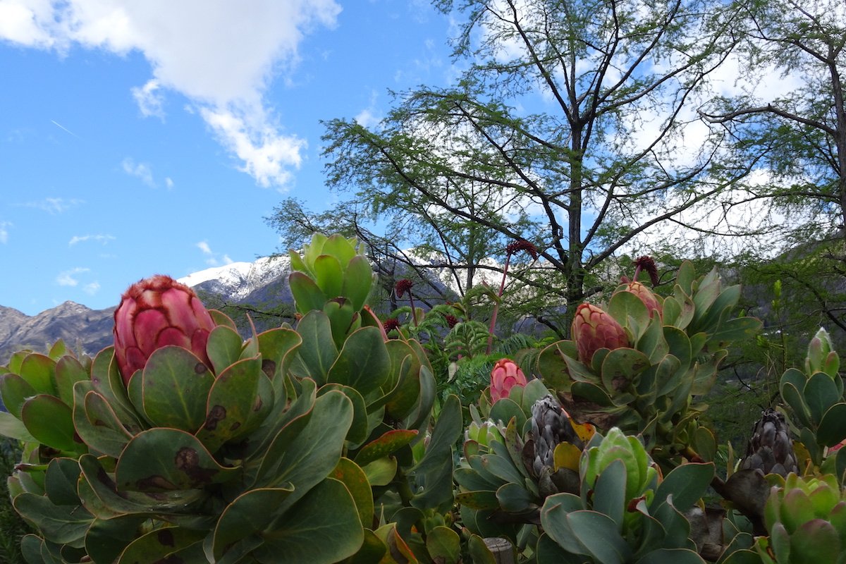Eine Etage höher entfaltet sich die Vegetation Südafrikas. Proteas blühen, ihre silbrigen Blätter rascheln im Wind, dahinter blitzt das Blau des Sees auf, als wäre es der Atlantik an der westlichen Küste Südafrikas. Die Insel läuft im südafrikanischen Fynbos-Bereich aus, und es mag zeitweise das Gefühl aufkommen, als stünde man auf einem Schiffsdeck, besonders dann, wenn das Blau des Sees zu beiden Seiten aufleuchtet. Auf dem Rückweg beeindrucken Agaven und Opuntien aus dem südamerikanischen Bereich.