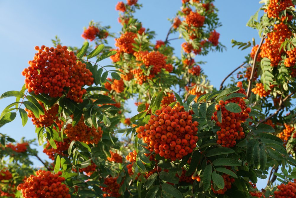Die Vogelbeere steht einzeln oder wächst in Hecken, hat gefiederte Blätter und einen leuchtend orange-roten Beerenstand, meist von August bis anfangs Oktober. Ein Fest für Seidenschwanz, Rotkehlchen, Gartenrotschwanz, Amsel, Wacholderdrossel, Singdrossel, Gartengrasmücke, Mönchsgrasmücke, Blaumeise, Star, Buchfink, Gimpel und Kernbeisser.