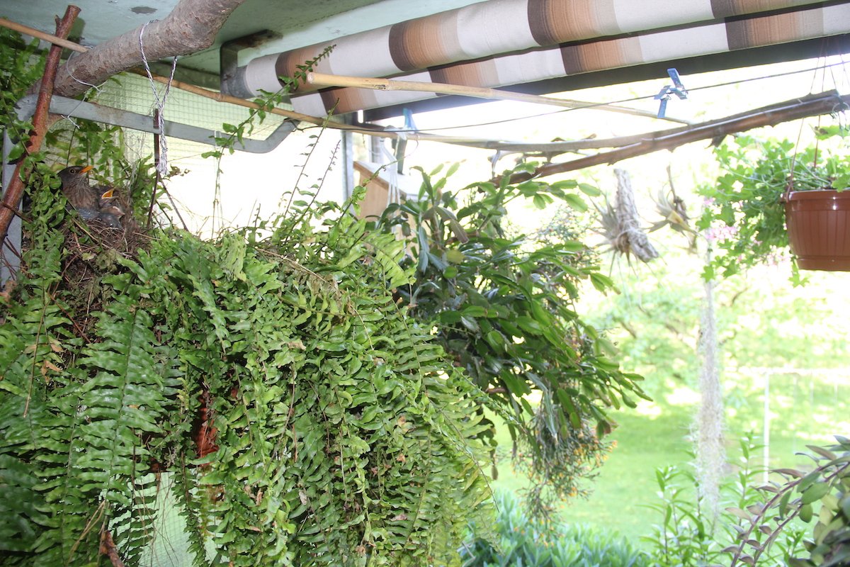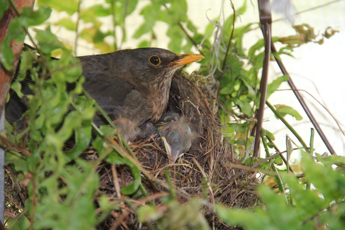Plötzlich liegen eines Abends Erde, Laub und Würzelchen auf dem Balkonboden. Amseln sind am Werk! Da, ein Flattern, schon sitzt das schwarze Männchen am Rand eines Balkonkistchens und stochert mit dem leuchtend dunkelgelben Schnabel in der Erde. Danach flattert es mit vollem Schnabel auf den Rand eines hängenden Topfes. Jetzt fliegt auch das braune Weibchen herbei, hält das Köpfchen schief. Das Paar erkundet einen Brutplatz. Anderntags dann die freudige Feststellung: ein Nest! Das Amselpaar hat es innerhalb nur eines Tages mitten in einem aufgehängten Grünlilien-Topf errichtet. Für die Pflanze nicht optimal, aus Amselsicht aber eine gute Nistplatzwahl. Das Nest ist wettergeschützt, weder Katzen noch Marder gelangen dazu, Elstern und Krähen wagen sich kaum, so nahe beim Fenster Nestraub zu betreiben.