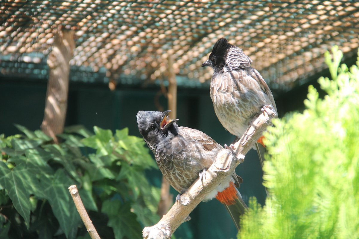 Vogelausstellung inmitten von Pflanzen und Blumen