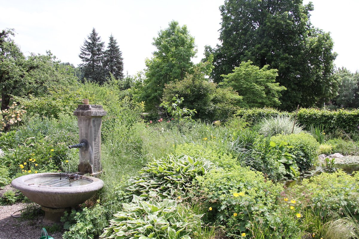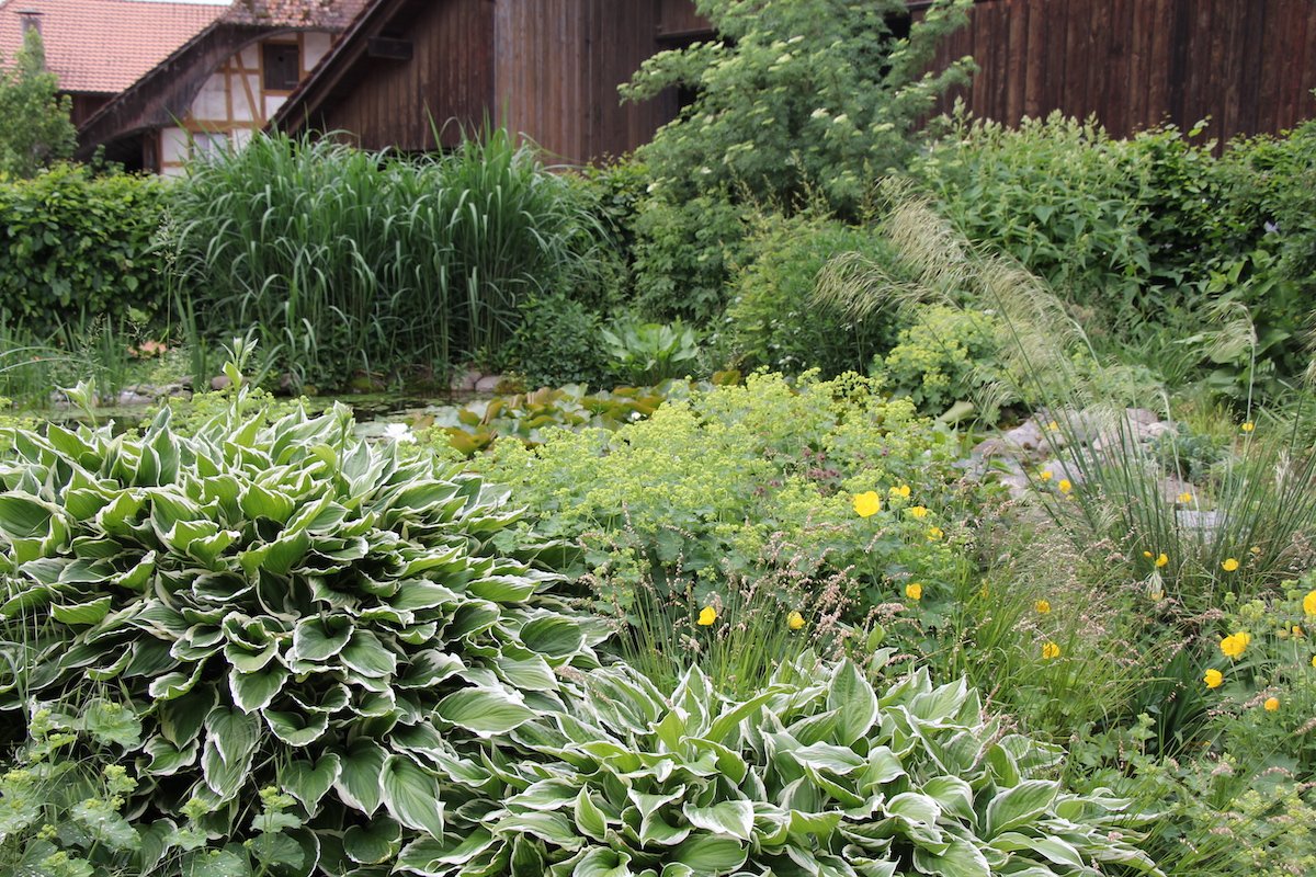 Der Garten von Rosmarie Mosimann hat von allem etwas. Im Südteil vor dem Haus bildet ein Weiher mit Seerosen einen Blickfang. Schattige Stellen sind eingefasst von Funkien, deren wuchernde herzförmige Blätter tropisches Flair verströmen. Mit den unterschiedlichen Blattfarben eignen sie sich ideal für den Schattengarten und kontrastieren mit den filigranen Farnen. Die Rodgersia bereichert mit verzweigten, grossen Blättern die Formenvielfalt des Grüns. Silbern glitzern die Blätter des Frauenmantels.
