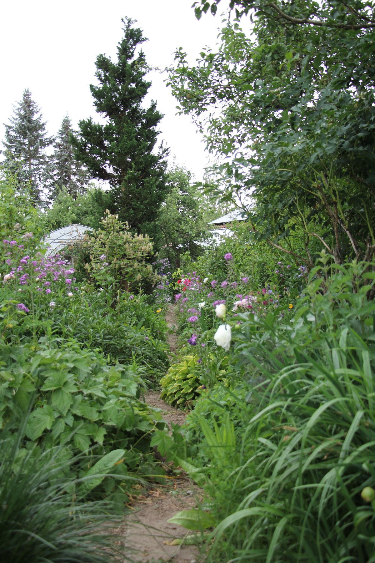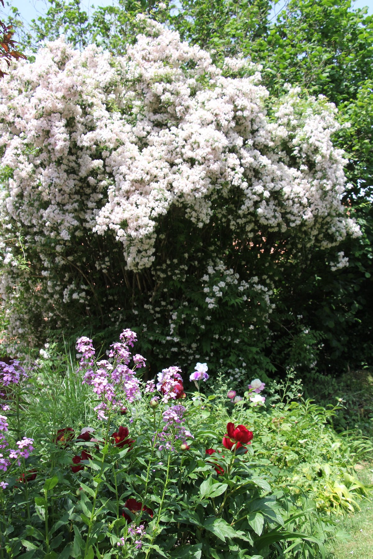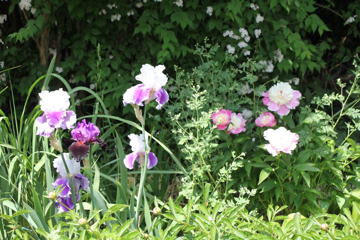 Dahinter Iris in Lila- und Weisstönen, als würden sie Ballett tanzen und nicht bemerken, dass sie gleich überspült werden von der Kolkwitzie, einem Strauch, dessen blütenbesetzten Äste sich wie eine schäumende Meereswelle neigen.