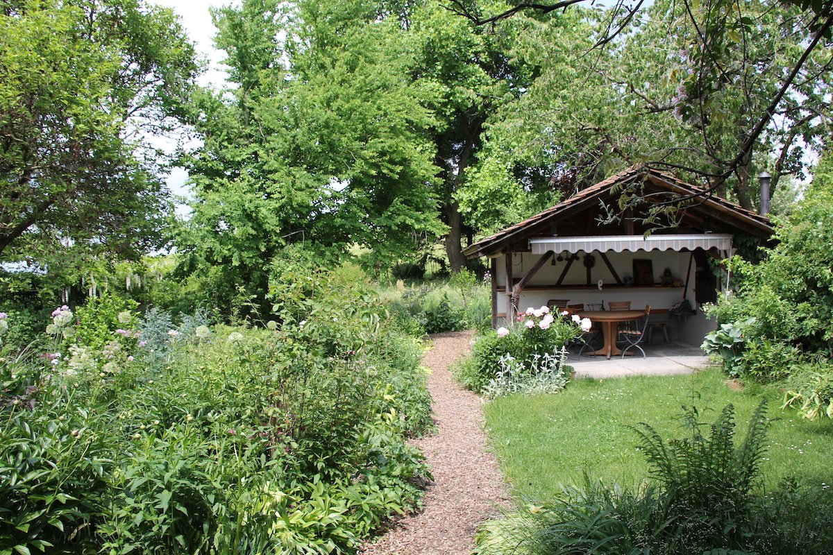 Ihr Garten erstreckt sich rund um ihr Wohnhaus, ein im Jahr 1775 erbautes Stöckli. Jakob Mosimann wuchs nebenan als Bauernsohn auf. Der Garten wirkt verwachsen und harmonisch, als hätte die Natur einfach so ein Bild hingezaubert. In den natürlichen Landschaften gibt es keine harten Ecken. Deshalb sind in Mosimanns Garten die Ränder der Beete gewellt. Das Gegenteil eines barocken Gartens, wo die Natur in Formen gepresst wird. Auch wenn alles wild und natürlich wirkt, betont Rosmarie Mosimann: «Ich verbringe täglich viele Stunden mit Gartenarbeit.»