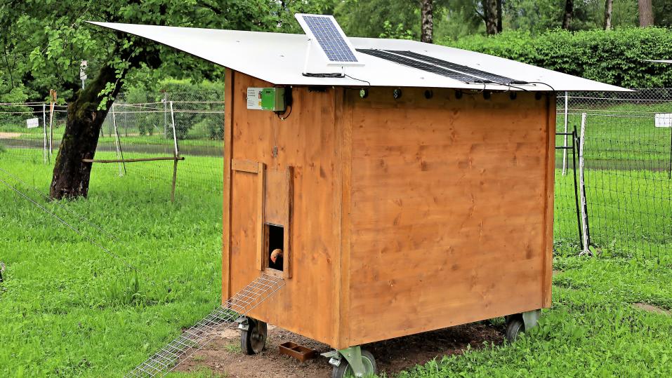 Solarpanels zur Erzeugung von Strom sind heute in jeder Grösse und mit fast jeglicher Leistung erhältlich. Auch in abgelegenen Ferienhäusern und Campingwagen dienen sie der Stromerzeugung. Aber auf Hühnerhäusern sind sie kaum zu sehen.