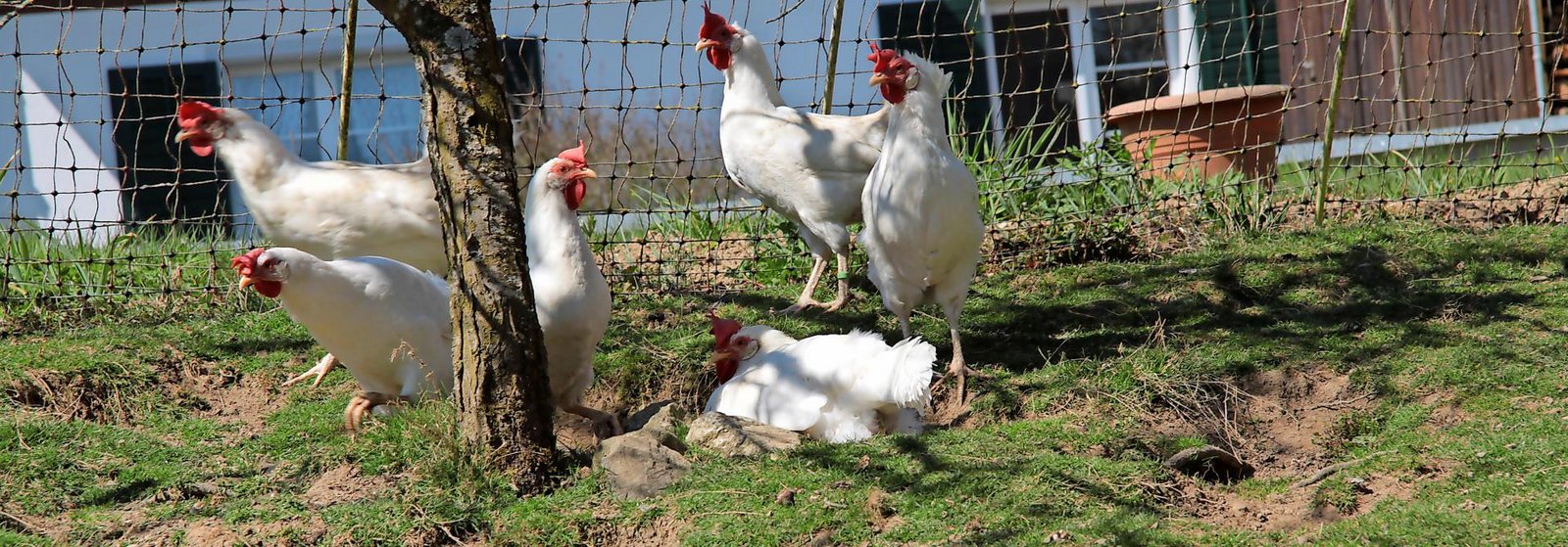 Sollten die Hühner trotzdem kahle Stellen verursachen, empfiehlt es sich, einen Teil des Auslaufs abzusperren und wieder anzusäen. Die Hühner sollten jedoch nicht zu früh in das frisch gekeimte Gras gelassen werden, weil sie sonst die Wurzeln gleich wieder auszupfen. Also geduldig sein und warten, bis man zweimal gemäht hat, dann sind die Graswurzeln stark genug. Ein zu stark beanspruchter Hof ist auch eine Brutstätte für allerlei Krankheitskeime. Deshalb sollte man den Auslauf, wenn Regen angesagt ist, auch mal mit Kalk bestreuen. Dieser neutralisiert den vielen Kot ein wenig, den die Tiere liegen lassen. Scharren die Hühner immer am selben Ort, können dort auch Gitter gelegt werden. Das Gras wächst dann durch das Drahtgeflecht, die Scharrenden können zwar Gras picken, die Wurzeln jedoch nicht aus der Erde reissen.