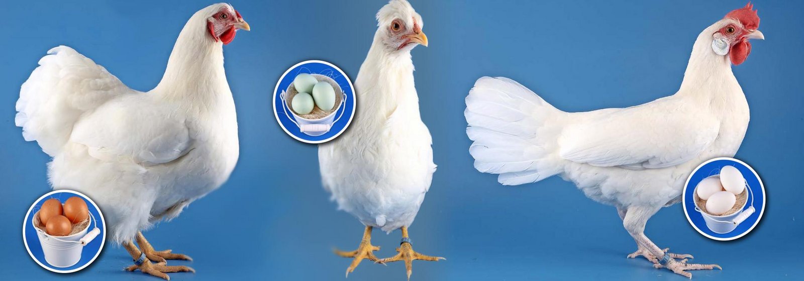 Sie tragen alle ein weisses Gefieder, doch die Schalenfarbe ihrer Eier ist unterschiedlich. Türkis, braun oder weiss – die genetische Herkunft bestimmt die Eierfarbe von Deutschen Wyandotten, Zwerg-Minorka und Schijndelaar.