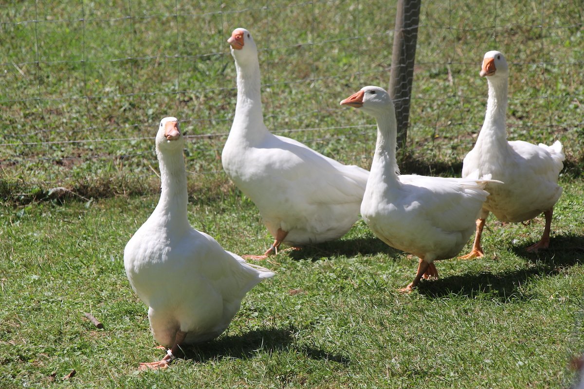 Schnattern und quaken. «Jetzt könnt ihr raus», sagt Kathrin Gerber und öffnet das Törchen. Drei Pommernenten watscheln an einem Morgen Anfang September über das Gras. Die schwarzen Gefiederteile schillern grünlich im jungen Sonnenlicht. «Sie können sich tagsüber frei auf dem Hof tummeln, doch wenn am Morgen noch Nebel über dem Boden hängen, müssen sie warten, sonst schleicht sich der Fuchs an», erklärt Kathrin Gerber. Ihr Mann Beat hat frühmorgens schon das Rätische Grauvieh und die Hinterwälder Rinder auf die Weide gelassen.