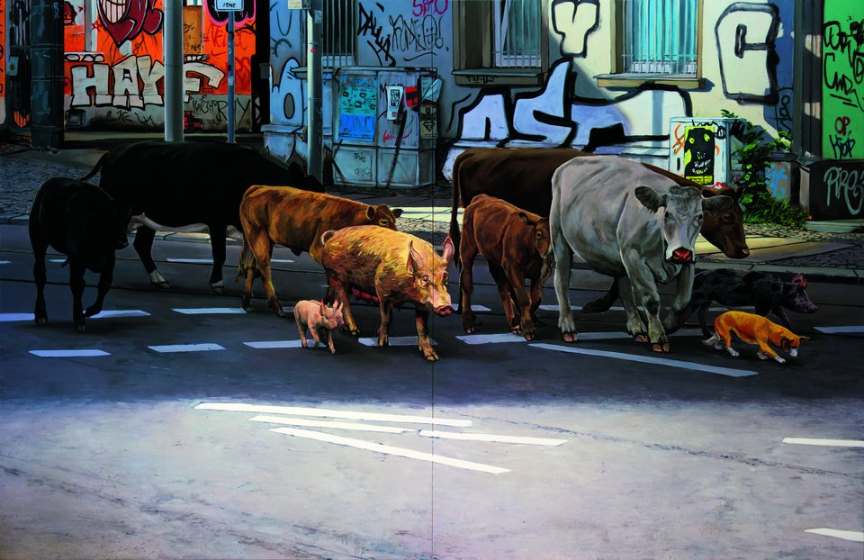 Im Titel «Animal Utopia» steckt zwar die Utopie drin, allerdings sind meine Bildwelten der heutigen Alltagswelt entlehnt und die Transformation hin zu einer zukunftsfähigen, klimagerechten Gesellschaft ist noch nicht vollendet. Die Frage nach guten Lebensbedingungen für Menschen und andere Tiere bleibt insofern in den Bildern noch offen. Grünere Städte ohne Autos etwa wären ja nicht nur für andere Tiere, sondern auch für uns Menschen Orte mit höherer Lebensqualität. Wenn sich auf meinen Gemälden, den Mastanlagen und Schlachthöfen entrückt, Kühe, Hühner und Schweine die von Menschen geprägten Räume erobern, geht es mir dabei zunächst auch um Irritation. Denn es gibt heute weitaus mehr Hühner und andere sogenannte Nutztiere als Menschen, aber wir bekommen sie kaum zu Gesicht. In meinen Bildern treten diese Tiere als handelnde Subjekte in Erscheinung und begegnen den Menschen auf Augenhöhe. Die heute vorherrschende Objektivierung dieser Tiere zu schieren Ressourcen und Waren wird so zurückgewiesen.