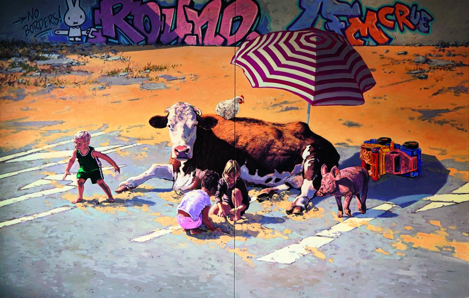 Hartmut Kiewert vertritt eine dezidierte Meinung zum Umgang mit Nutztieren. Diese bringt er in Gemälden zum Ausdruck, in denen die Tiere aus ihrer gewohnten Umgebung ausbrechen. Dass diese Bilder mehr als utopischer Kitsch sind, zeigt sich im Gespräch mit dem Künstler.