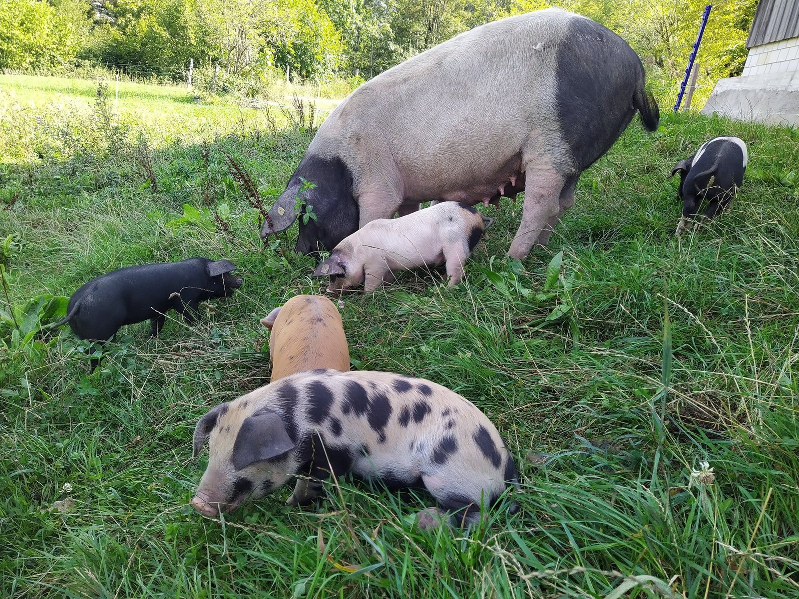 Da Schweine sehr intelligent sind, zeigen sie Charaktereigenschaften, wie wir sie von anderen intelligenten Tieren wie etwa Hunden kennen. Sie spielen gerne und sind sehr neugierig. Ihr Geruchssinn ist ausgeprägt. Mit ihrer Rüsselscheibe (Schnauze) erkunden sie die Umgebung intensiv durch Wühlen. Das ist eins ihrer wesentlichen Bedürfnisse, welches in den meisten Haltungssystemen nicht erfüllt wird. Häufig fehlt es den Schweinen an Beschäftigung. Neben dem Wühlen benagen und bekauen sie gerne Äste und Wurzeln. Schweine sind sehr reinlich, sie koten und harnen nicht in ihren Schlafplatz. Sind die Stallflächen zu klein, wie in den meisten konventionellen Haltungssystemen, ist ihnen diese Trennung nicht möglich. Schweine sind sehr soziale Tiere, ausser…