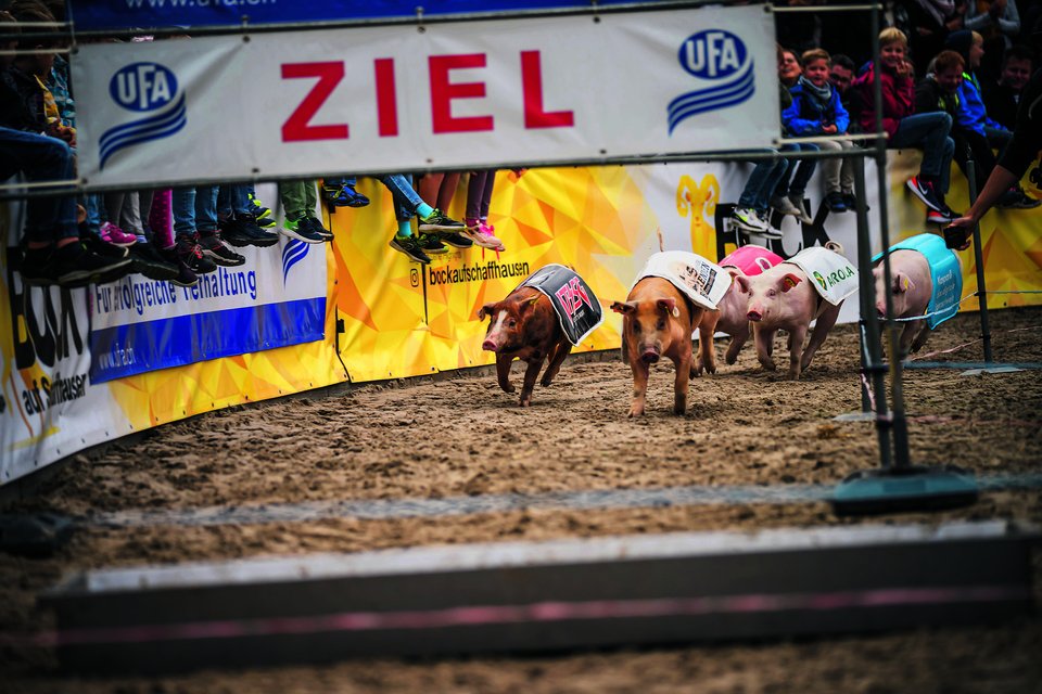 Zu «Galopp» aus der Ouvertüre zu Rossinis Oper «Wilhelm Tell» rasen die Schweine über den Parcours, wo sich am Ziel nicht nur die Siegerin den Magen mit Leckerli vollschlägt. Seit einem Vierteljahrhundert sind die Rennschweine der Publikumsrenner an der Ostschweizer Landwirtschaftsmesse. Sie kommen aus dem Stall der Familie Milz, die im Weiler Hofen bei Amlikon-Bissegg im Thurgau Schweinemast und Milchwirtschaft betreibt.
