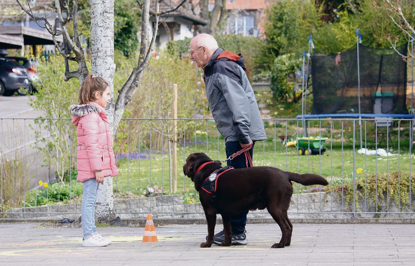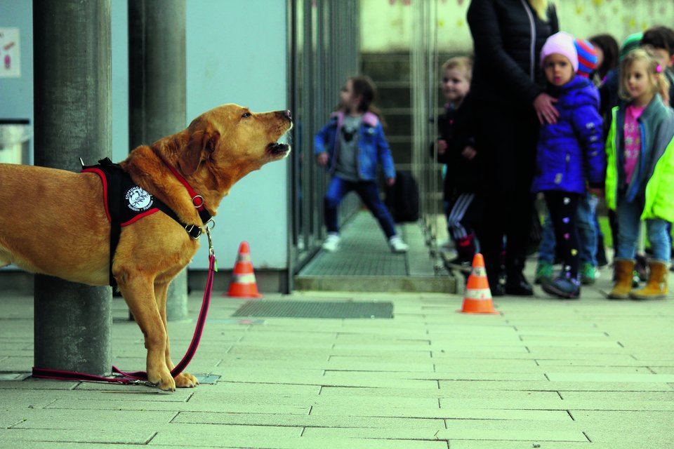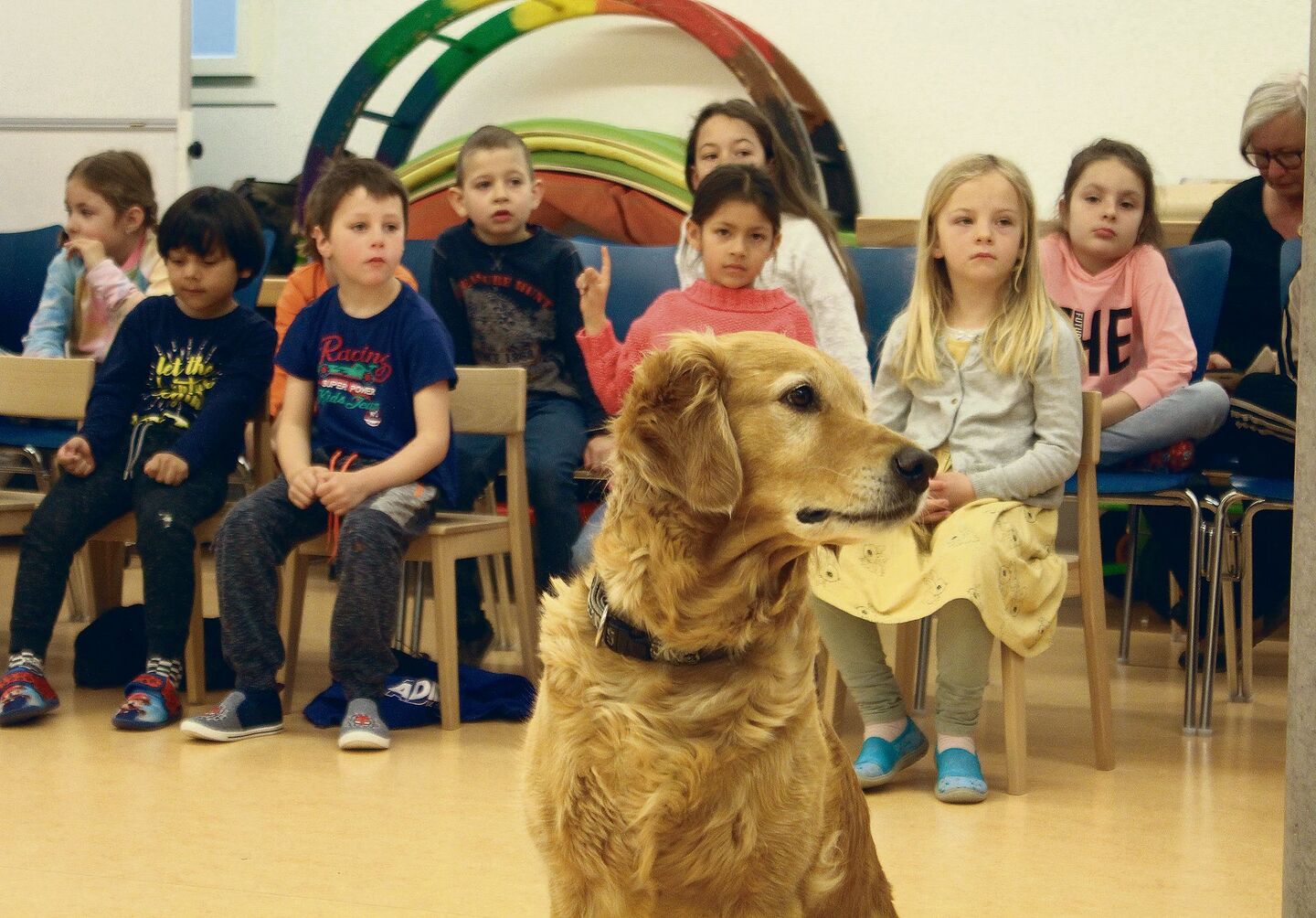 Kiro, Mila, Leon, Yuma und Amun liegen tiefenentspannt dort, ihren Frauchen und Herrchen zu Füssen. Labrador, Lagotto, Labrador, Golden Retriever, Labrador – in dieser Reihenfolge. Die fünf Mensch-Hund-Duos sollen den Kindern in den nächsten zwei Stunden beibringen, wie man sich fremden Vierbeinern gegenüber verhält. Ohne Angst, aber mit Respekt.