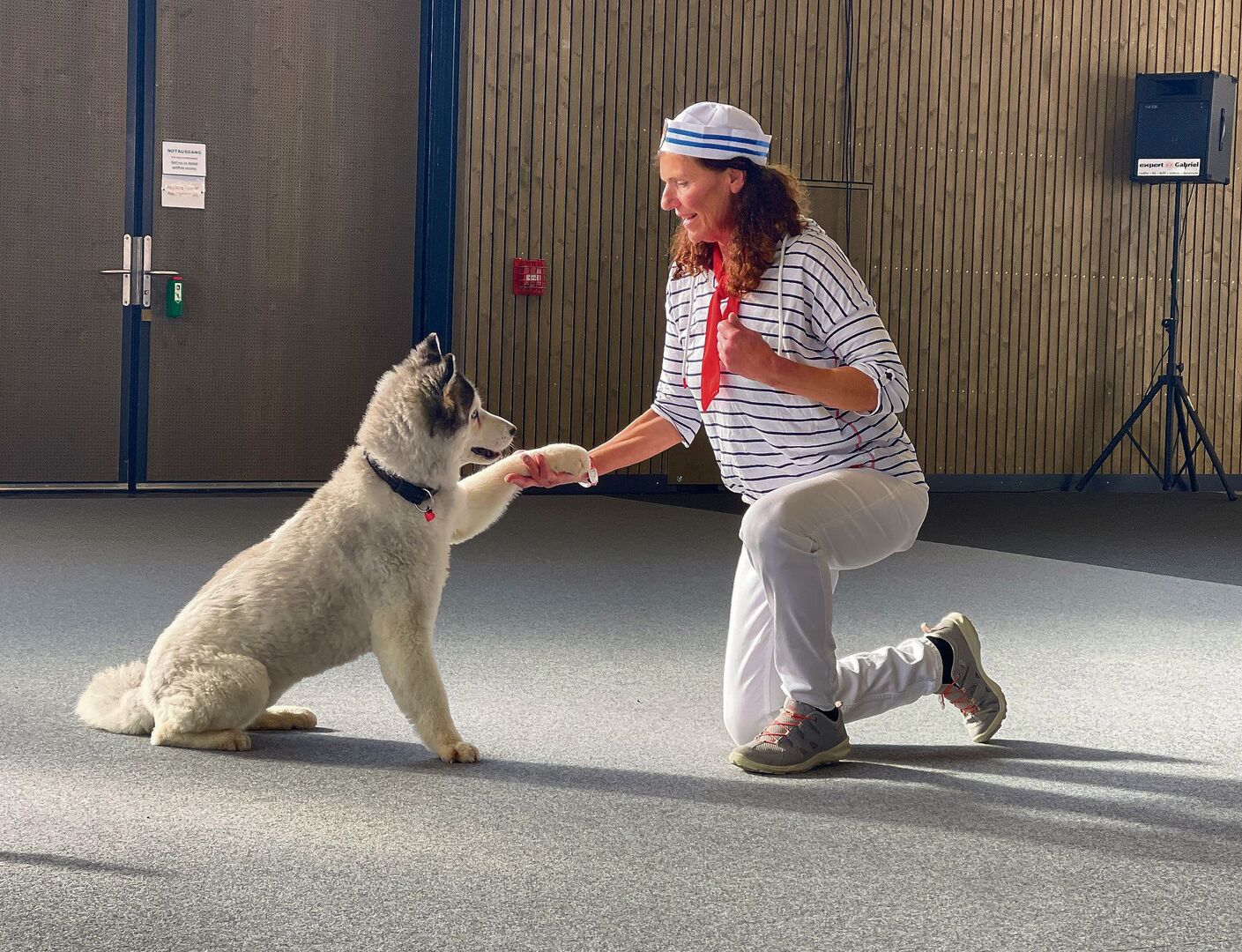 In einem Matrosenkostüm betritt Eva Karrer mit ihrer Husky-Hündin Fendi die Arena an der Schweizer Hundemesse in Winterthur. Fendis Aufmerksamkeit gilt ganz ihrem Frauchen, als die Musik einsetzt. «What shall we do with the drunken sailor?» («Was sollen wir mit dem betrunkenen Seemann machen?») – passend zum Liedtext wiegt sich der Husky rhythmisch von links nach rechts. Gemeinsam präsentiert das Duo eine mitreissende Dogdance-Show mit eleganten Tanzschritten, akrobatischen Sprüngen und kreativen Tricks, die das Publikum begeistern. Der tosende Applaus am Ende ist ihnen sicher. Nach der Vorführung wird die Arena umgebaut, und die Messebesucher erhalten Einblicke in weitere Hundesportarten wie Agility, Hoopers, Treibball und Fitness-Loop.