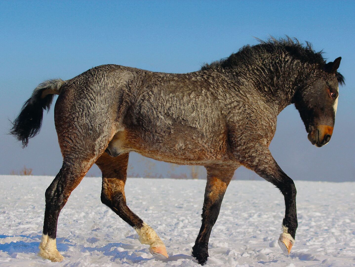 Analog zu den gelockten Golden- oder Labradoodles gibt es auch eine spezielle Pferderasse, die durch ihr lockiges Fell auffällt. Die American Bashkir CurlyHorses (kurz Curly Horses) tragen vor allem im Winter ein aussergewöhnlich gekräuseltes Fell, sogar die Mähne, der Schweif und das Fell in den Ohren wirken, als ob mit Lockenwicklern nachgeholfen wurde.Verantwortlich dafür ist das Curly-Gen. Neben der Fellstruktur unterscheidet sich auch der Geruch der Curlys deutlich von dem der übrigen Pferderassen – er erinnert eher an Lammfell. Erfahrungsberichte von Pferde-allergikern zeigen, dass weniger oder gar keine Symptome im Umgang mit Curly Horses auftreten. Deshalb wurde diese Pferdrasse als hypoallergen erklärt. Einerseits würden die Curly Horses weniger Allergene produzieren und andererseits gelangten diese weniger in die Umgebung, so die Erklärung. Denn die Haut und das Fell dieser amerikanischen Pferde enthalten viel Talg, welcher die Allergene binden kann.