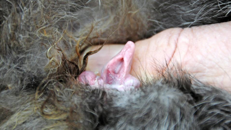 Im Weiteren müssen die Geschlechtsecken kontrolliert werden. Übel riechende Ablagerungen von Drüsensekreten können mit einem feuchten Tuch oder mithilfe eines Wattestäbchens einfach entfernt werden. Auch die Geschlechtsorgane bedürfen einer Überprüfung. Kaninchen mit entzündeten Geschlechtsteilen oder Geschlechtskrankheiten werden von der Bewertung ausgeschlossen. Bei Rammlern ist speziell auf Hängehoden und fehlende Hodensäcke zu achten. Feuchte Stellen oder gar Verfilzungen im Genitalbereich, der Blume oder der Innenseite der Hinterläufe könnten auf einen Spaltpenis hindeuten.