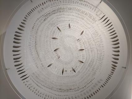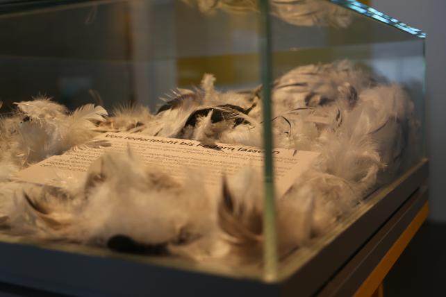 Auf dem Museumsrundgang gibt es viel über die Hühner zu erfahren. Plötzlich begegnet einem eine Wand mit hundert verschiedenen Hühnergesichtern. Etwa so viele Artgenossen kann eine Henne voneinander unterscheiden. In einer Plexiglasbox wird visualisiert, wie viele Federn ein Huhn trägt. Die Federn bestehen aus Keratin und werden aufgrund der Abnutzung einmal jährlich ausgewechselt. Je nach Körperstelle gibt es verschiedene Federn mit unterschiedlichen Funktionen. Auf verschiedenen Tellern wird einem der Speiseplan von Hühnern serviert, der vom Regenwurm über den Käfer bis zu Steinchen reicht.