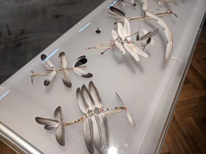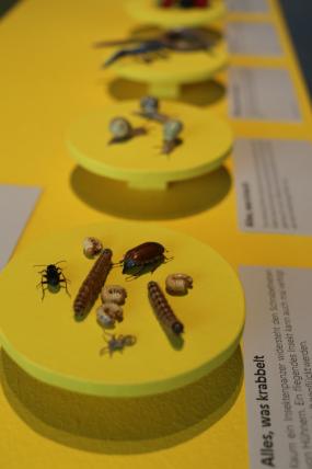 Die Hühner haben einen ausgeprägten Sehsinn, der dem Fluchttier beinahe eine Rundumsicht mit einem Gesichtsfeld von 300 Grad ermöglicht. «Der rote Hahn auf dem Dach» steht für einen Hausbrand und wird in der Ausstellung mit einem roten Feuerwehrhelm visualisiert. Die «Pflaumenglucke» ist eine Schmetterlingsart und das «Rothals-Getreidehähnchen» ein rund fünf Millimeter grosser Käfer, der streifenförmige Löcher in die Blattnerven des Getreides frisst und in der Ausstellung zu bestaunen ist.