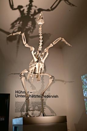 Begrüsst wird man im Museum zu Allerheiligen in Schaffhausen durch ein imposantes Skelett. Dabei handelt es sich nicht etwa um einen Dinosaurier, sondern um ein übergrosses Hähnchen. Das «Monument» ist ein zehnfach vergrössertes Masthähnchen-Skelett, geschaffen vom Künstler Andreas Greiner aus Berlin (D).