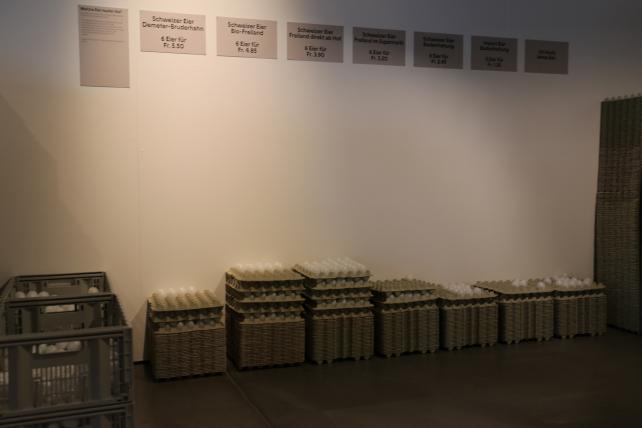 Welche Eier kaufen Sie? Diese Frage richtet sich an die Besucher, die mit einem künstlichen Ei abstimmen können, ob sie bei ihrem Einkauf sechs Importeier für 1,35 Franken oder lieber sechs Demeter-Bruderhahn-Eier für 5,50 Franken kaufen. Die wirtschaftliche Bedeutung der Hühner in der Schweiz ist mit grafischen Elementen aufgearbeitet. In der Schweiz gab es vor hundert Jahren erst drei Millionen Hühner, heute sind es 13 Millionen. Dabei verdoppelte sich die Anzahl der Nutzhühner erst in den letzten 20 Jahren.