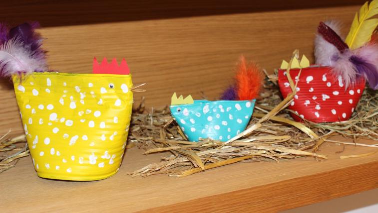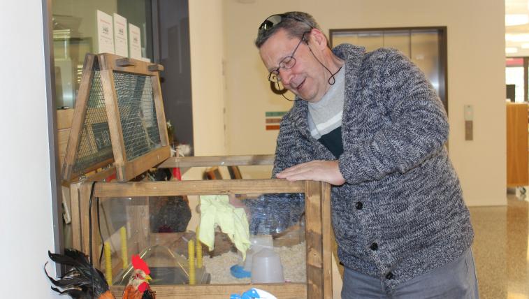Als im vergangenen Frühling die Küken aus der Casa Falveng wieder zurück in die Zucht gebracht wurden, schlug Eggler vor, im kommenden Jahr das Projekt aus den Schulen ins Seniorenzentrum zu übertragen. In den vergangenen Jahren haben sich viele der 90 Bewohner und 160 Angestellten bereits an den munter heranwachsenden Federbällchen erfreut. Die Ausstattung zum Ausbrüten war vom Schulprojekt vorhanden und die langjährige Erfahrung hatte gezeigt, wie viel Freude das Beobachten beim Schlüpfen und die Hege von Küken Alt und Jung bereitet. Die Leiterin Aktivierung des Seniorenzentrums war begeistert. Seither plant sie für diesen Frühling das Projekt «Kunstbrut im Seniorenzentrum». Die Deko wurde mit den Bewohnern schon frühzeitig im Werken mit Gips angefertigt sowie bunte Hühner aus Blechdosen gebastelt. Und im Erzählcafé wa- ren Geschichten von Tieren und speziell von Hühnern aktuell.