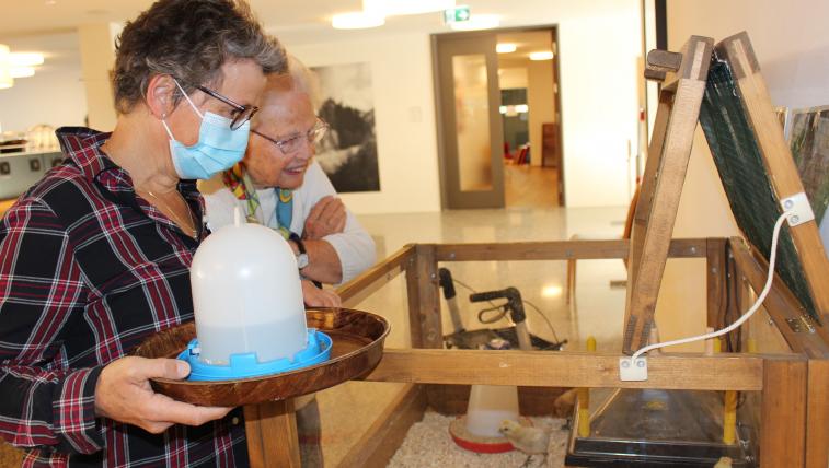 Nach etwa drei Wochen in der Casa Falveng wurden die Küken wieder zu ihren Artgenossen in die Kleintieranlage von Hermann Eggler nach Igis GR gebracht. Die Bewohner haben einen Ausflug dorthin geplant, wo sie «ihre» Bibeli besuchen möchten.