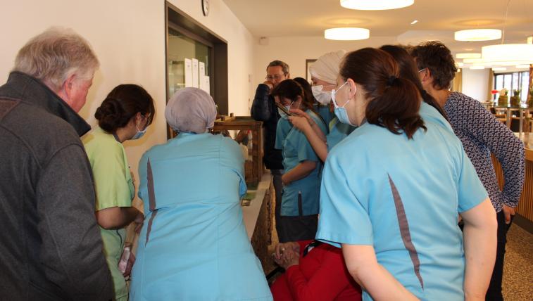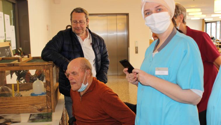 Als die Frühschicht der Putzequipe zur Pause am Brutapparat vorbeiging, begann das erste Ei, sich zu bewegen, und das erste Bibeli erblickte das Licht der Welt. Jetzt ging es rund um den Brutapparat zu und her wie in einem Ameisenhaufen. Das Hauswirtschaftsteam dokumentierte alles mit dem Handy. Einige Senioren liessen sich im Rollstuhl zum Geschehen bringen, andere machten nur einen kurzen Spaziergang ausser Haus, um ja nichts zu verpassen. Die frisch geschlüpften Bibeli lagen am Anfang noch nass und erschöpft im Inkubator. Viele Bewohner sorgten sich schon, ob es diesen auch gut gehe. Aber nach einiger Zeit hatten sich die Küken von den Strapazen erholt und hüpften bereits umher. Als sie dann vollständig trocken waren, konnte Eggler die frisch geschlüpften Seidenhuhn-Küken ins warme Kükenheim bringen.