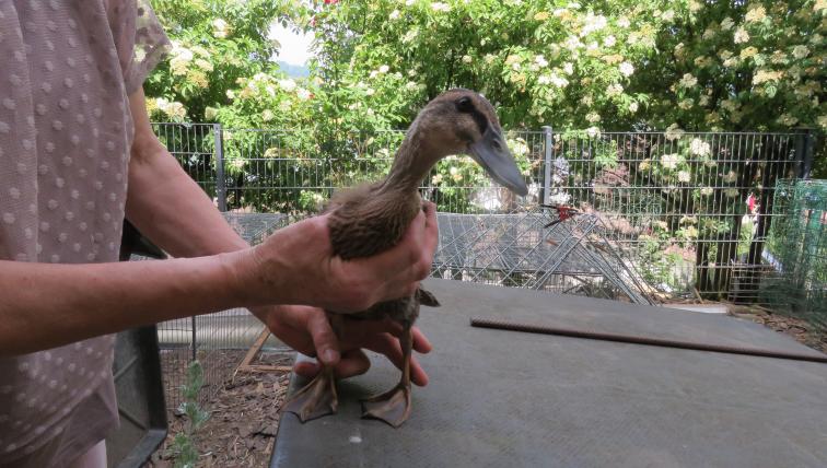 Seit zwanzig Jahren züchtet Pia Oechslin Laufenten. Bei der Rasse gibt es zehn anerkannte Farbenschläge, Oechslin züchtet deren vier: schwarz, weiss, wild- und forellenfarben. Jede Farbe hat im Garten ihr eigenes Gehege. Bei der Besichtigung der Behausung der forellenfarbenen Laufenten bekommt Erpel Wuschel gleich noch ein paar Streicheleinheiten. Dass Oechslin ihre Tiere liebt, spürt und sieht man.