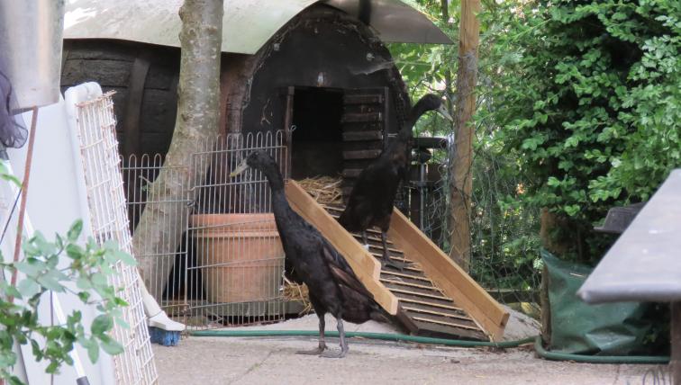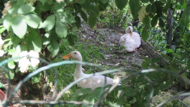 Einer der schwarzen Erpel möchte jetzt in sein Häuschen. «Das Weibchen, das darin brütet, wird ihn gleich wieder rausschmeissen», prophezeit die Oechslin – und so ist es auch. Bereits einige Sekunden später hat die Ente den Erpel wieder vor die Tür gesetzt. So watschelt dieser halt wieder mit seinen Kumpels durch den Garten. Umherlaufen lassen kann Oechslin ihre Enten ohne Sorge, denn bis zur Strasse hinunter gehen sie nicht.