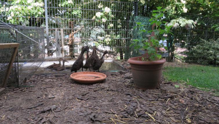 Für die wildfarbene Ente ist es bereits die zweite Brut. Ihre ersten, bereits etwas älteren Küken befinden sich in der Obhut eines schwarzen Weibchens, das ebenfalls schon etwas ältere Junge hat. Oechslin schützt den Nachwuchs gut vor Füchsen, Mardern und Katzen, von denen es in der Nachbarschaft so einige gibt.