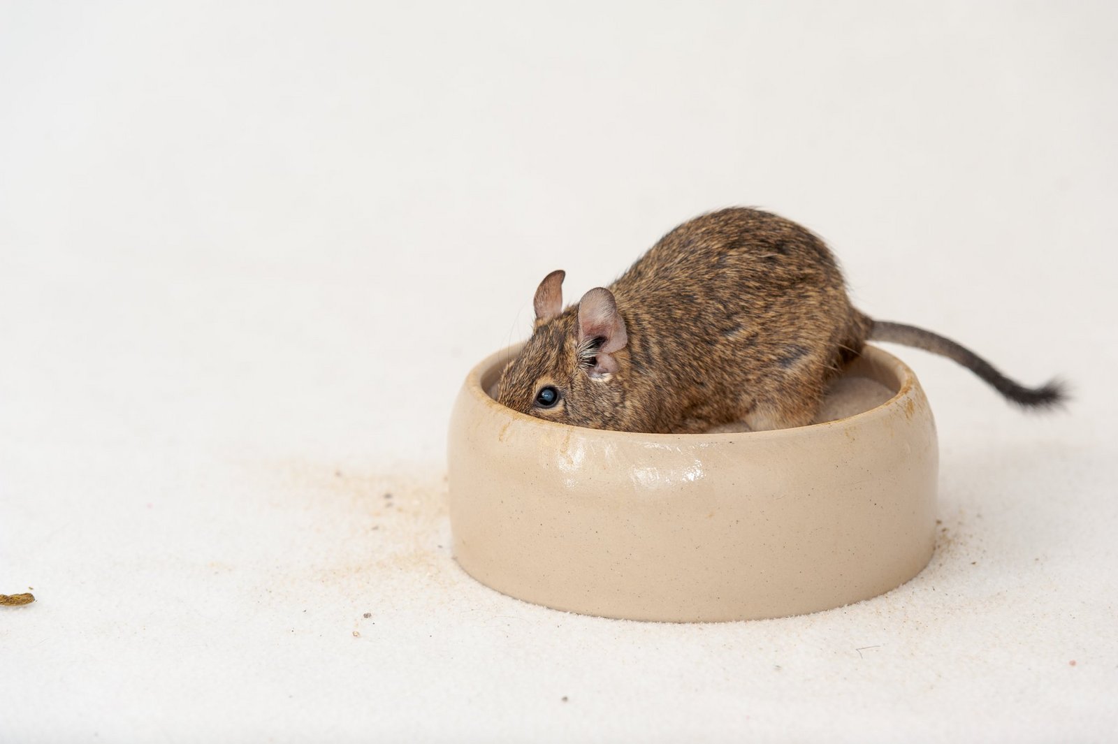 Als Sandbad eignen sich hohe Schalen oder Bonbongläser. Gerade bei Rennmäusen sollten die Öffnungen aber gross genug sein, sonst kann es zu plötzlichen Revierkämpfen führen.