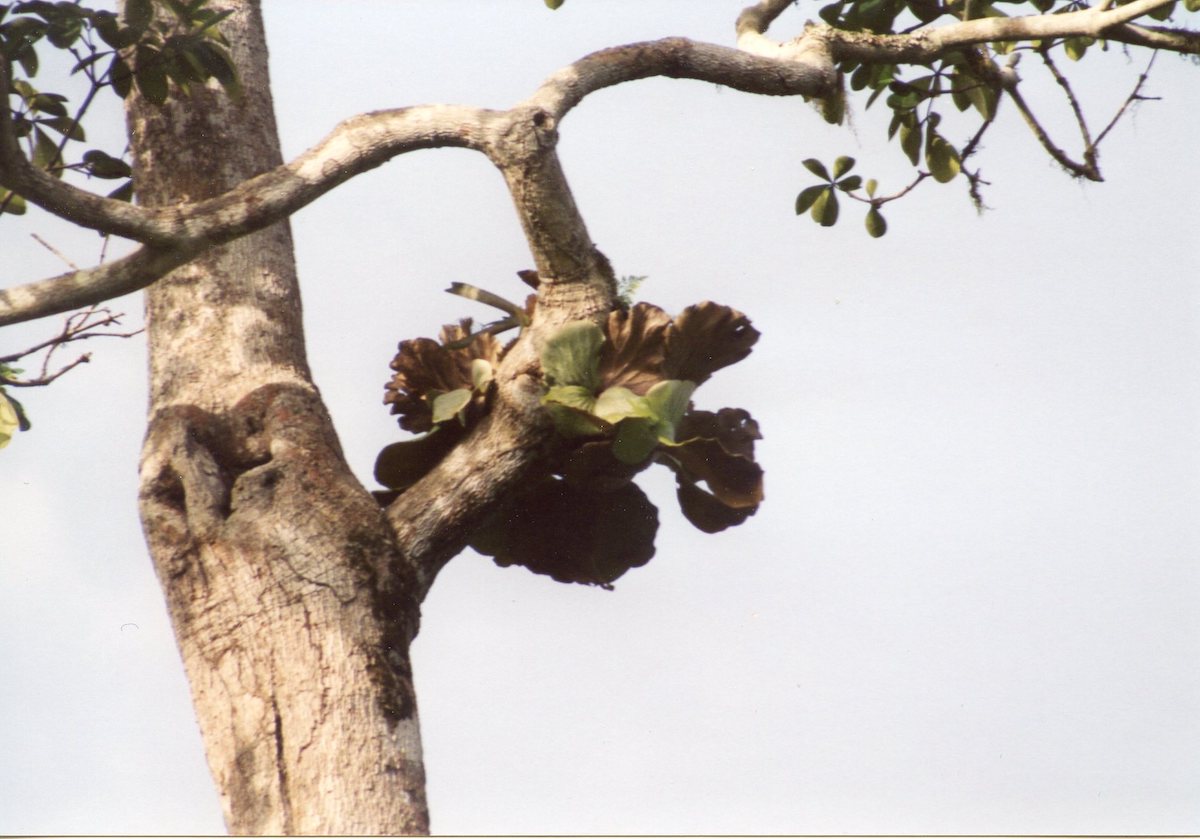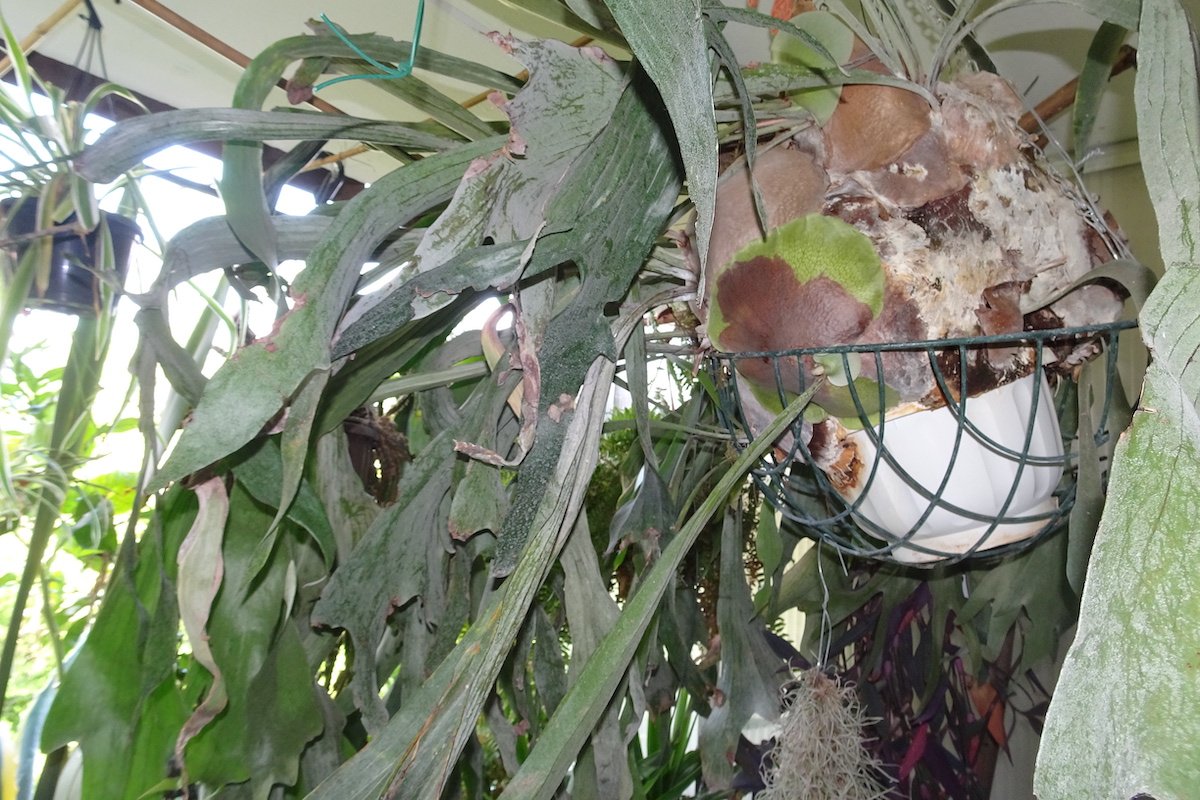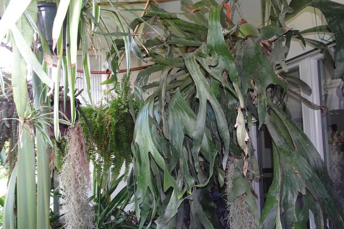 Dass Geweihfarne, als adrette Topfpflanzen erworben, auch in Privathand so gross werden, ist gar nicht unwahrscheinlich. Bedingung ist, dass sie in ein Gefäss gesetzt werden, das aufgehängt werden kann. Mit den Jahren wird das Gefäss von Blättern umwachsen, bis es nicht mehr zu sehen ist.