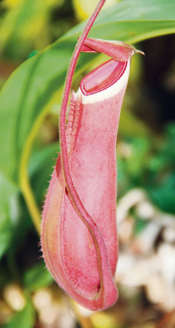 Was aber noch viel verwunderlicher ist, sind die grünen bis rötlichen Kannen mit halb offenen Deckeln, die an langen Stängeln hängen. Sie wachsen aus den Blattspitzen. Die Madagaskar-Kannenpflanze gedeiht als Strauch, bedient sich aber des dürren Geästs auch als Stütze, um sich rankend in die Höhe zu arbeiten. In der Nähe erstreckt sich ein Sumpf mit schwärzlichem Wasser. Hier finden die Wurzeln der Pflanze kaum Nährstoffe. Sie hilft sich anderweitig und fängt Insekten mit ihren auffälligen Kannen. Dabei geht sie tückisch vor.