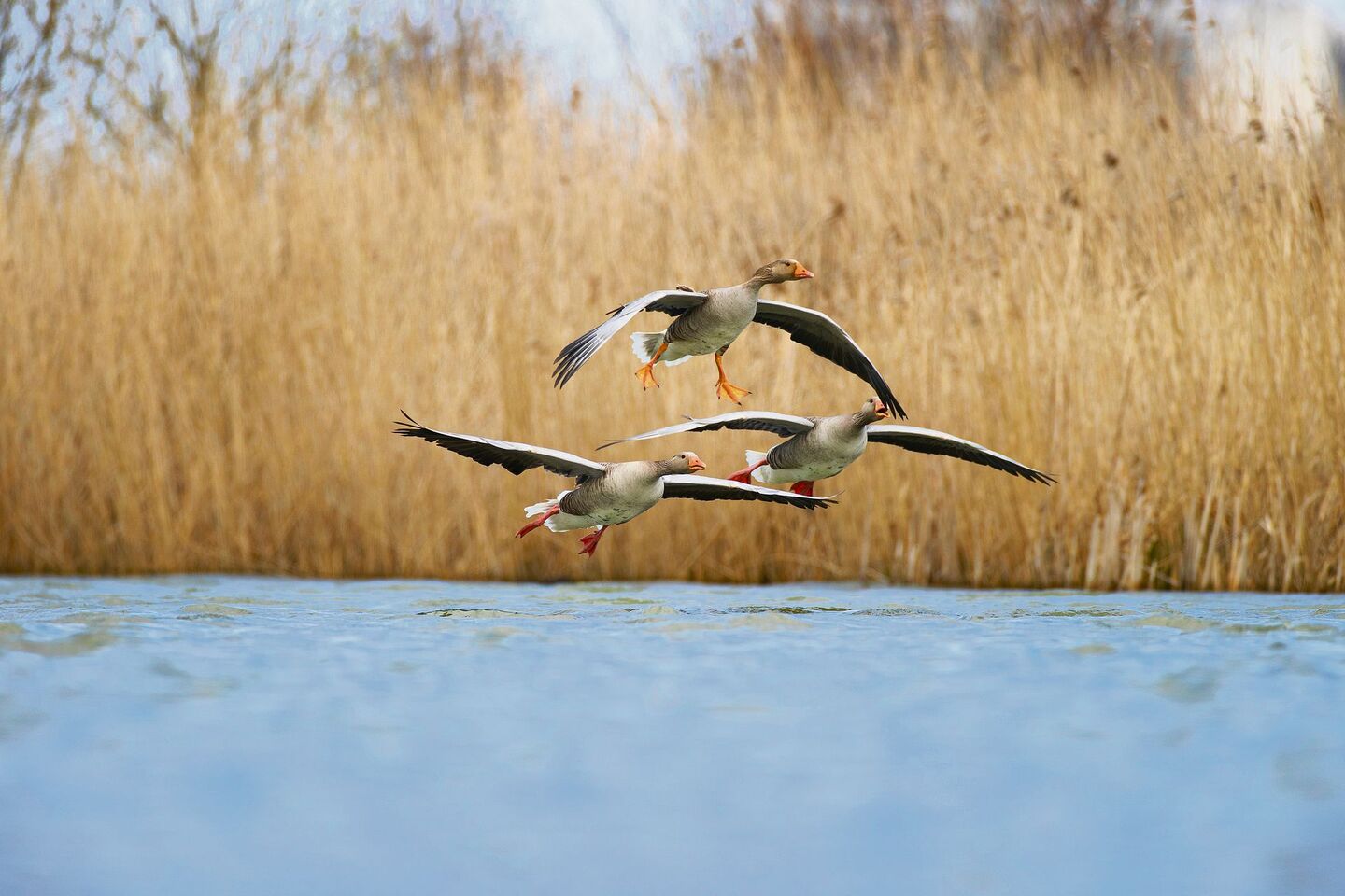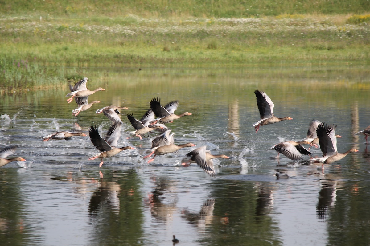 Sie heben sich kaum vom Acker ab. Zwei Graugänse schauen an einem frühen Frühlingsmorgen wachsam um sich, schnäbeln dann wieder in der Erde nahe dem Naturschutzgebiet Fanel am Neuenburgersee. Ihr braunes Gefieder tarnt sie perfekt. Nur ihre orangefarbenen Schnäbel leuchten. Später am Tag weidet eine ganze Schar auf einer Grasfläche. Ob es die gleichen Gänse sind, die dann gegen Abend auf einem Teich beim BirdLife-Naturzentrum La Sauge über die Wasserfläche brausend einfliegen?