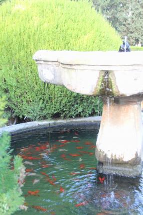 Längst hat man sich in den Palastzimmern verloren, folgt nur noch staunend den Fluren bis zum Ausgang in die Gärten. Ein Bassin voller rot leuchtender Goldfische im grünen Wasser ist im mittleren Bereich von Papyrus bewachsen. An der rötlichen Mauer im Hintergrund greifen Ranken der Kletterfeige, auf der Mauer stehen Töpfe mit Myrten, dahinter wecken Yukka-Kronen und Tamarisken erneut die Neugierde. Die Erkundung all der Gartenräume ist wie ein Film, der jede Minute Spannung bietet. Prachtvoll inszenieren Pflanzen Skulpturen und Pavillons. Mal sind sie formal geschnitten, dann wieder verleihen sie der Szenerie etwas Natürliches, Paradiesisches wie die grossen Monstera-Blätter, die den Boden einer Zitrusplantage bedecken, so weit das Auge reicht, und eine Urwaldidylle imitieren. Aus den Mündern steinerner Figuren, die mit Frauenhaarfarn überwachsen sind, spritzt Wasser, nie fehlen die Goldfische in den Teichen, Brunnen und Bassins.