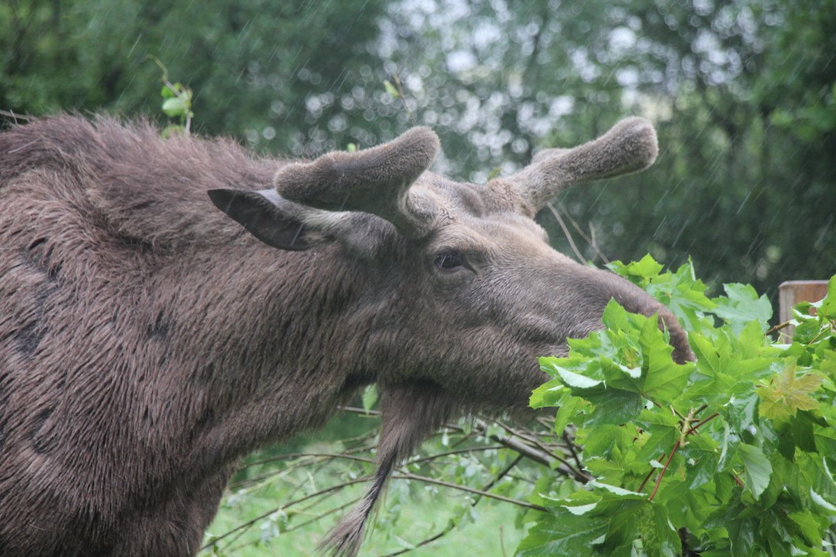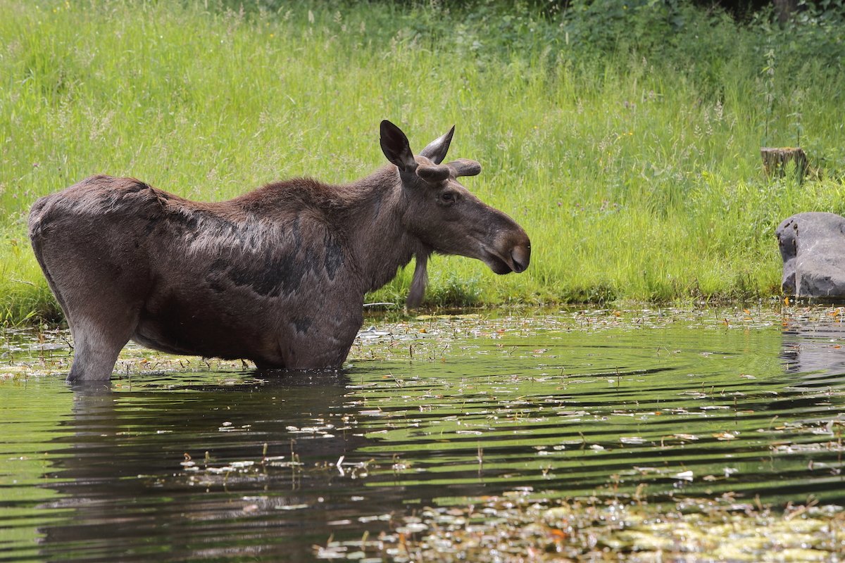 Der Elch streift durch nordische Wälder. Fast wie in der Natur kann dieser Hirschartige im Tierpark Langenberg bei Zürich beobachtet werden. Er streift dort durch dichte Vegetation, über offene Flächen, badet und trotzt jedem Wetter. Auf zum Elchbesuch!