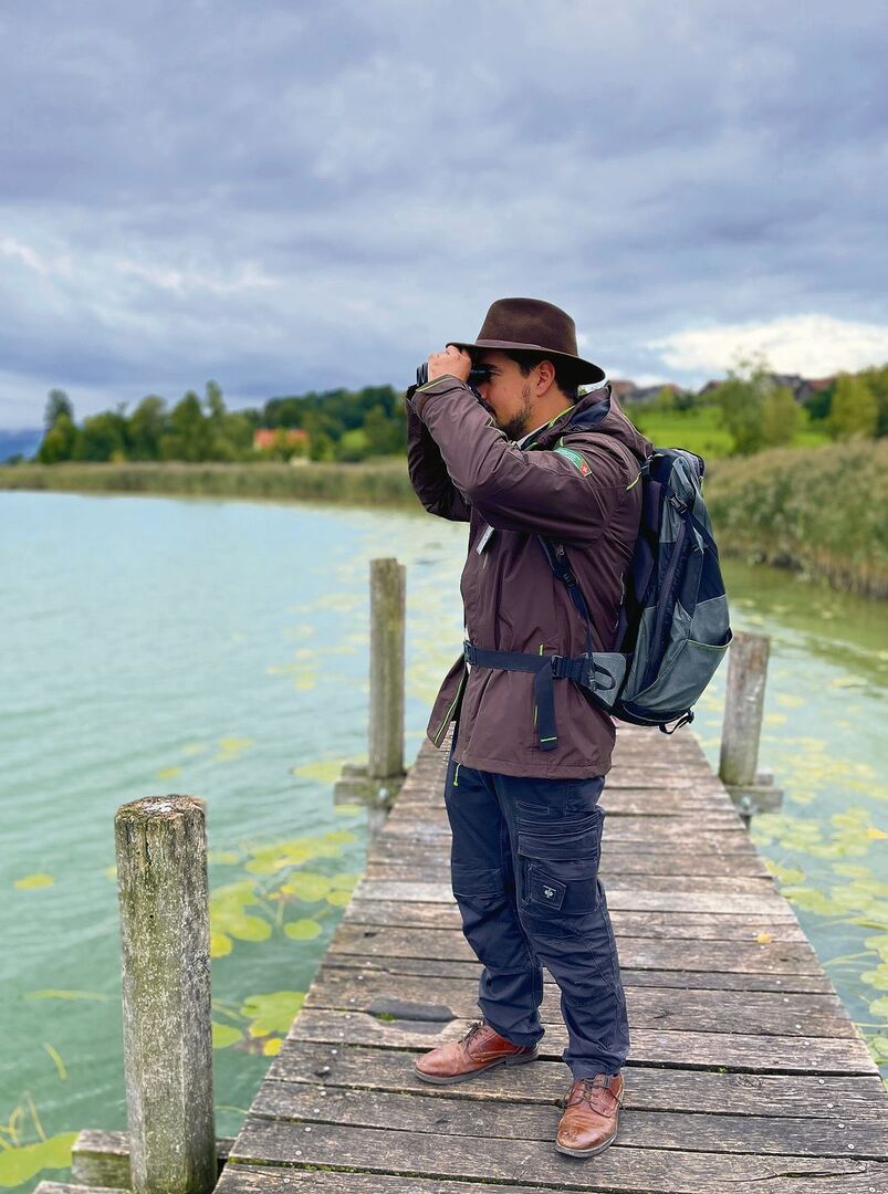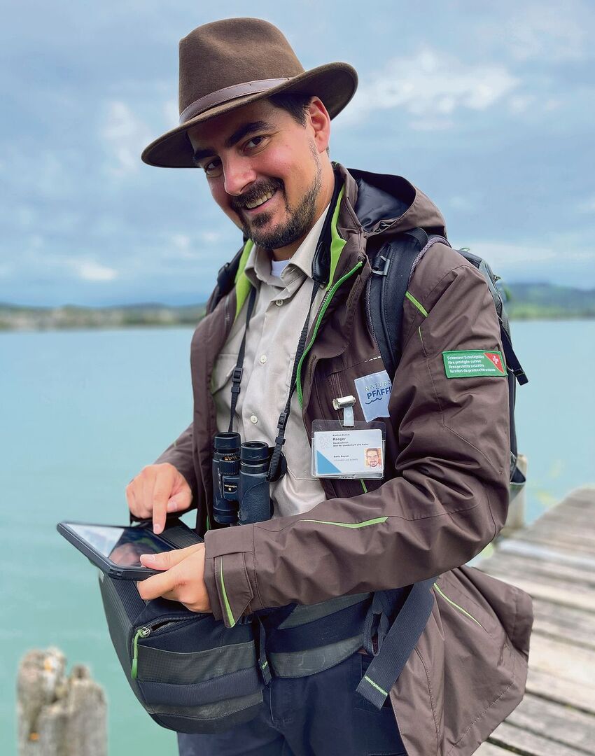 Um diese einzigartige Natur zu erhalten, gelten in Naturschutzgebieten daher für Besucher besondere Regeln. So dürfen zum Beispiel die Wege nicht verlassen werden und Hunde gehören an die Leine. Dass diese Regeln eingehalten werden, dafür sorgt Dario Bayani. Der 34-Jährige ist Leiter des Rangerdienstes am Pfäffikersee. Ausgerüstet mit Fernglas, Rucksack und iPad macht sich Bayani auf zu seiner täglichen Runde um den See.