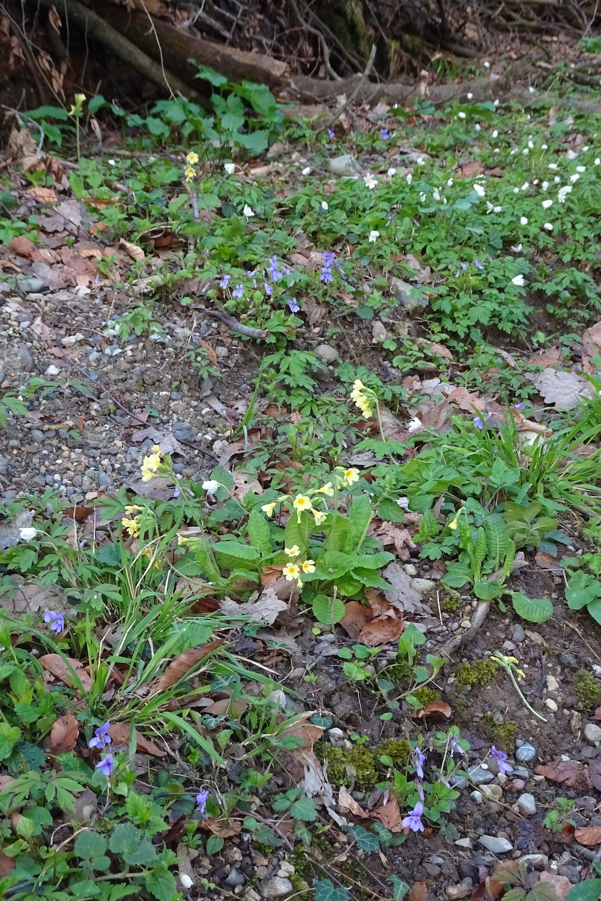 Weitere Frühblüher sind das Wald-Veilchen und die Schlüsselblume, eine Primelart. Welch ein Glück, wenn Buschwindröschen, Wald-Veilchen und Schlüsselblume auf gleichem Fleck blühen! Wer die Zeit so schön findet und sie gerne in die Länge ziehen möchte, kann das sogar machen! Wenn im Mittelland Buschwindröschen und Bärlauch welken, erwachen sie in höheren Lagen im Jura gerade erst. Eine gute Möglichkeit, nochmals in den Frühlingszauber mit Vogelgesang und Blütenmeer einzutauchen!