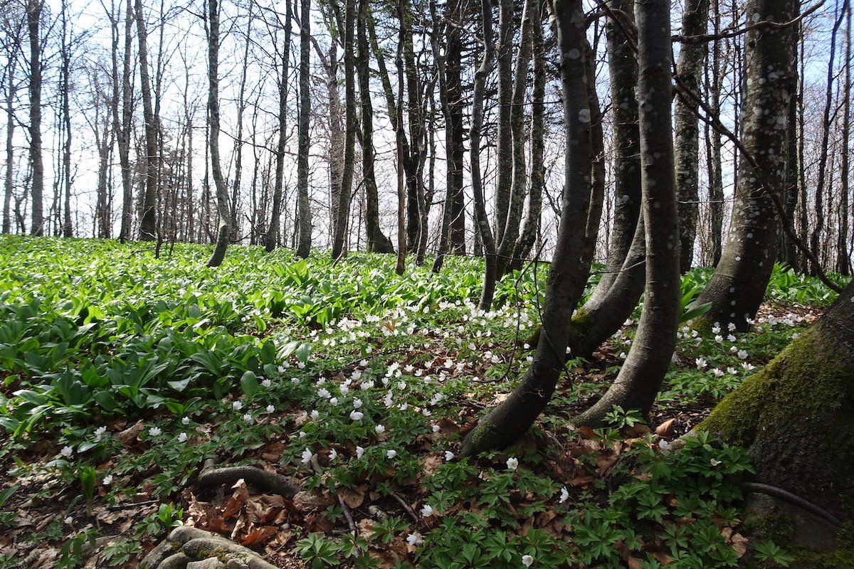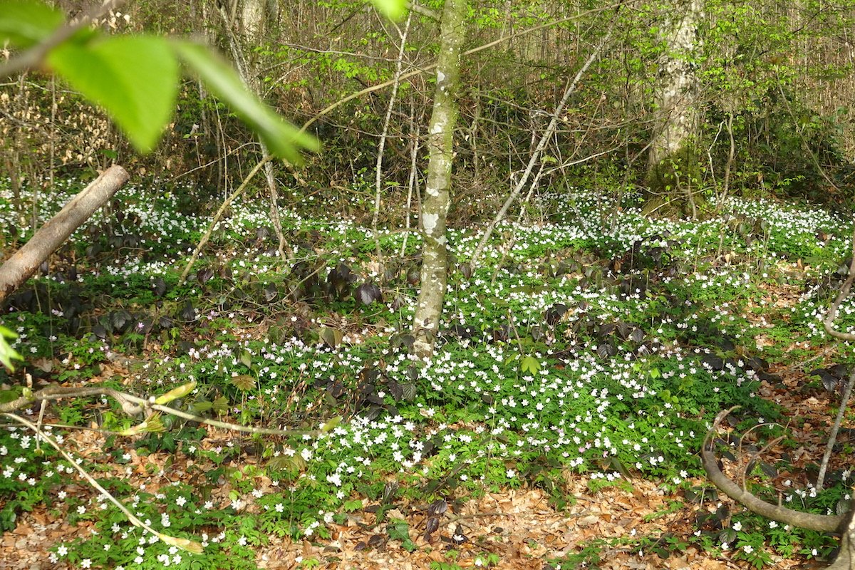Aus einem umgestürzten Wurzelstock schmettert ein Zaunkönig sein Lied. Sonnenstrahlen durchfluten den Wald und reichen bis auf die braune Buchenlaubschicht. Dort aber hat sich jetzt ein weisser Teppich gebildet. Buschwindröschen blühen im noch lichten Wald. Diese Frühblüher nutzen die Gunst der Stunde.