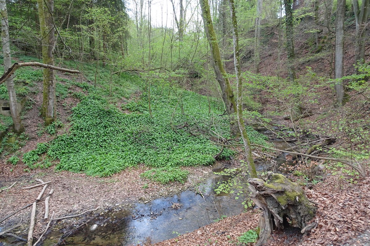 Gleichzeitig wie die Buschwindröschen gedeiht der Bärlauch, bevorzugt an feuchten Stellen. Die lanzenähnlichen, hellgrünen Blätter spriessen aus dem Buchenlaub und verwandeln Bachböschungen in grüne Flächen. Ein feiner knoblauchartiger Duft hängt im Tälchen mit glucksendem Bach.