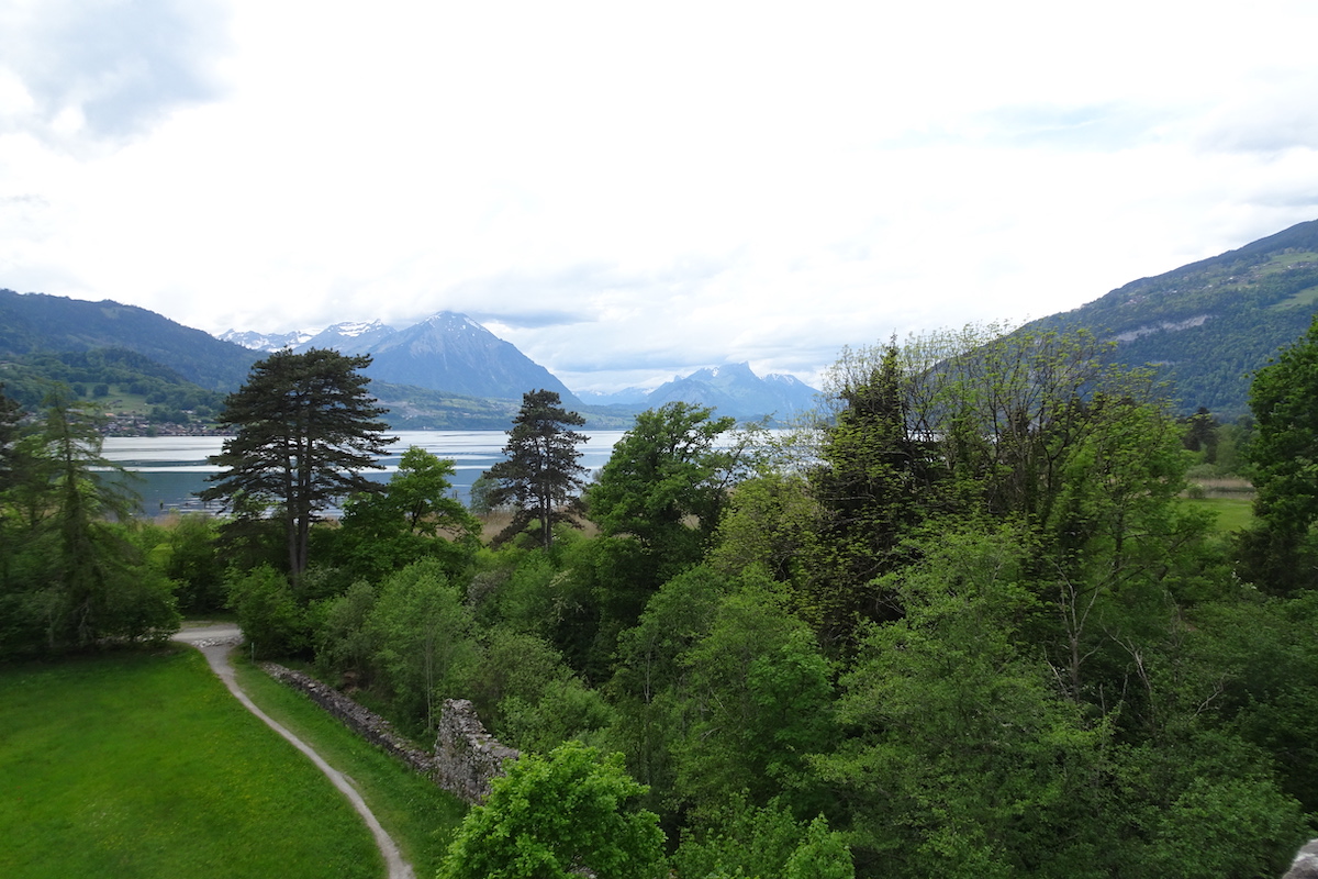 Kurz danach erinnern Ruinen an die Burg Weissenau aus dem 13. Jahrhundert. Ein alter Turm kann sogar bestiegen werden. Zuoberst fühlt man sich als Vogel, denn der Blick schweift weit. Der See ist nah und war nur durch urwaldähnliche Vegetation verborgen. Schilfflächen beim Naturschutzgebiet bieten Vögeln Unterschlupf, die nahen Berge ragen rundherum auf. Im Rücken liegt Interlaken, Kanal und Aare zeigen sich klar getrennt voneinander. Die Burg verfügte einst über einen Hafen. Von ihr aus liess sich der Warenverkehr über die Alpenpässe kontrollieren. Zudem lag sie gut geschützt auf einer ehemaligen Insel.