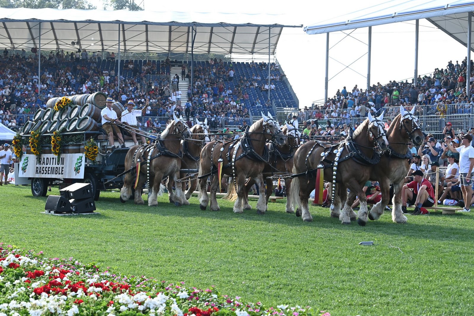 Und auch der Alltag im und um den Stall hat Tradition: Um 6.30 Uhr beginnt der Tag der drei Fuhrmänner mit Füttern, Misten und Putzen der Pferde. Nach dem Znüni geht es auf Fahrt. «Während der Woche sind es meist Trainingsfahrten in ganz unterschiedlichen Kombinationen», erklärt Cédric Gysin. Es wird zweispännig, vierspännig und manchmal sogar sechsspännig gefahren. Nach dem Mittagessen folgen Umgebungsarbeiten, denn die Fuhrmänner kümmern sich auch um den Umschwung des Feldschlösschen-Geländes. Danach geht es weiter im Stall, nochmals mit Füttern und Misten. Peter Nussbaumer, der Chef der Garde, betont, dass schätzungsweise 60 Prozent der Arbeit mit Putzen zu tun habe. Dazu gehört nicht nur das Reinigen der Pferde und der Boxen, sondern auch der Geschirre und Wagen. Unter der Woche werden auch die Sechsspänner-Auftritte vorbereitet. Peter Nussbaumer nennt diese Mission eine «Materialschlacht». Angerückt wird mit einem grossen Lastwagen, in dem die sechs Pferde untergebracht sind, einem Anhänger für den wuchtigen Bierwagen und noch einem 3,5-Tonnen Lieferwagen mit dem ganzen Material für Fuhrleute und Pferde. An manchen Anlässen sei man mehrere Tage gemeinsam unterwegs, erzählt Peter Nussbaumer, «da wird man fast zu einer Familie».