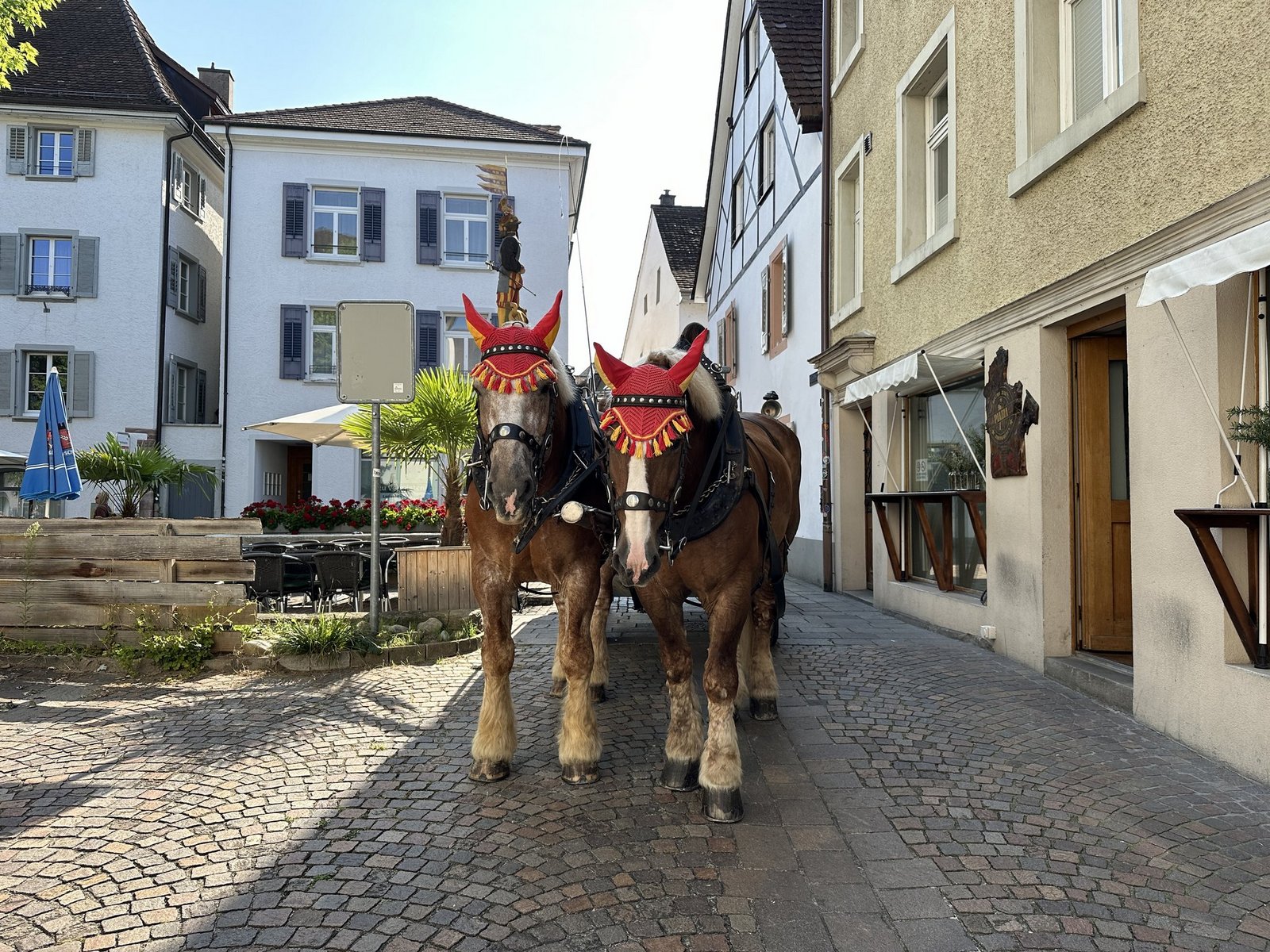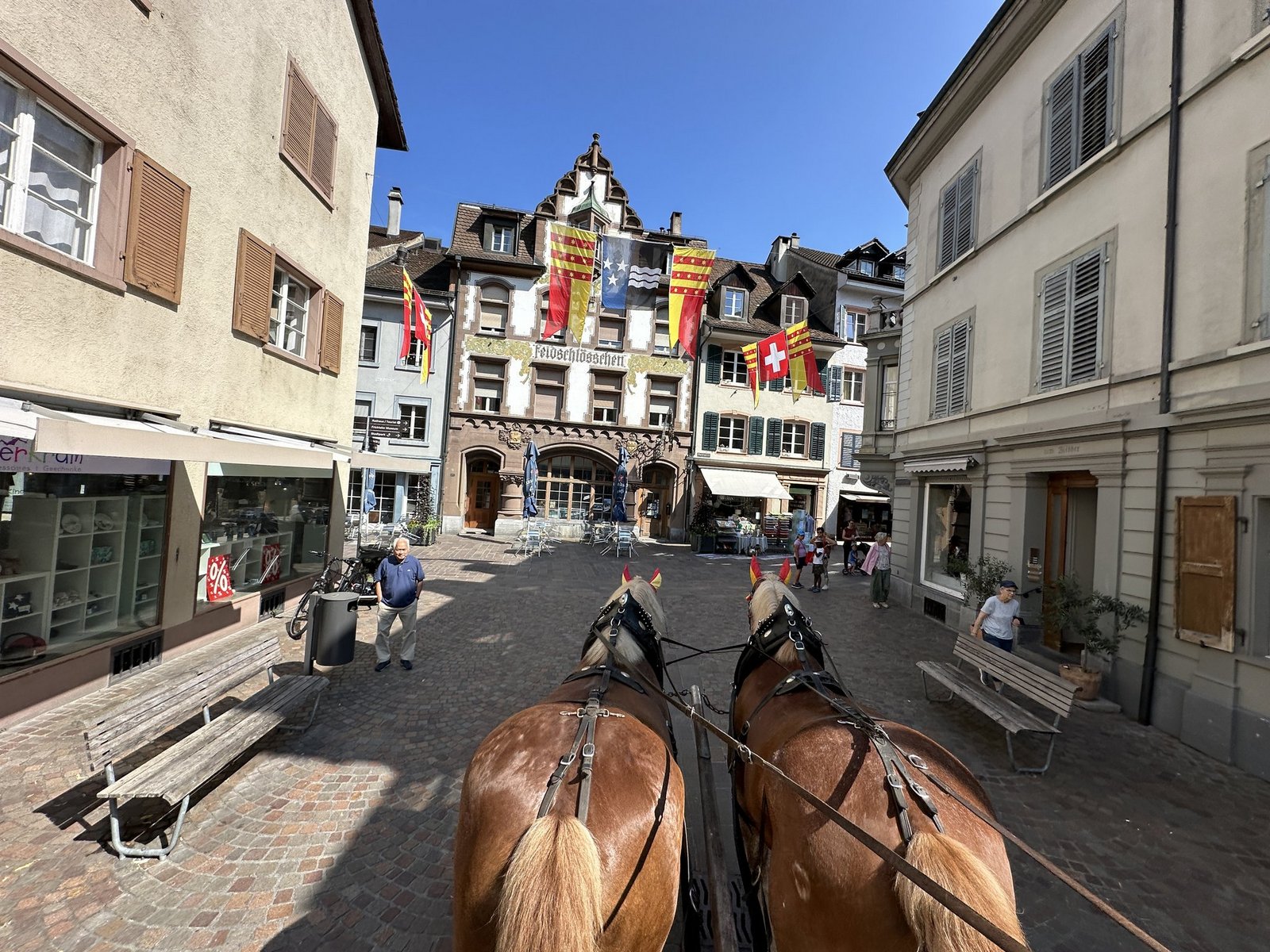 Aramis zuckt mit der Lippe, die Augen halb geschlossen, seine Ohren hängen etwas seitlich an seinem Kopf. Der 16-jährige Belgische Kaltblutwallach döst vor sich hin. An seiner Seite: Lord, ein Jahr jünger und genau so entspannt. Die beiden Pferde wissen wahrscheinlich nicht, dass sie fast schon Teil eines Zeitzeugnisses sind. Schon bald klappern ihre Hufe über das Kopfsteinpflaster des kleinen Städtchens Rheinfelden. «Wahrscheinlich hat das vor über 100 Jahren gleich geklungen», meint der 35-jährige Cédric Gysin, der die wöchentliche Kundentour mit den beiden Kaltblutwallachen fährt. Die Bierbrauerei Feldschlösschen beliefert jeden Donnerstag die ansässigen Kunden mit dem Pferdegespann. «Natürlich wäre die Belieferung per Lastwagen viel effizienter», doch darum gehe es nicht, betont er. Auf Kundschaft zu gehen, sei ein Privileg. Der grosse Bierwagen biegt um eine enge Ecke in der Altstadt und fährt beim ersten Kunden vor, der Piazza Bar. Die Besitzerin steht schon vor der Türe und grinst, als sie das Gespann kommen sieht. Die beiden Kaltblutwallache sind eine Wucht – 1,7 Meter gross und wiegen je fast eine Tonne. Auch ein kleines Mädchen ist von diesen Ausmassen beeindruckt: Sie wird von ihrer Grossmutter auf den Armen getragen, beim Vorbeigehen sieht sie die Tiere mit funkelnden Augen an und murmelt: «Rössli.»