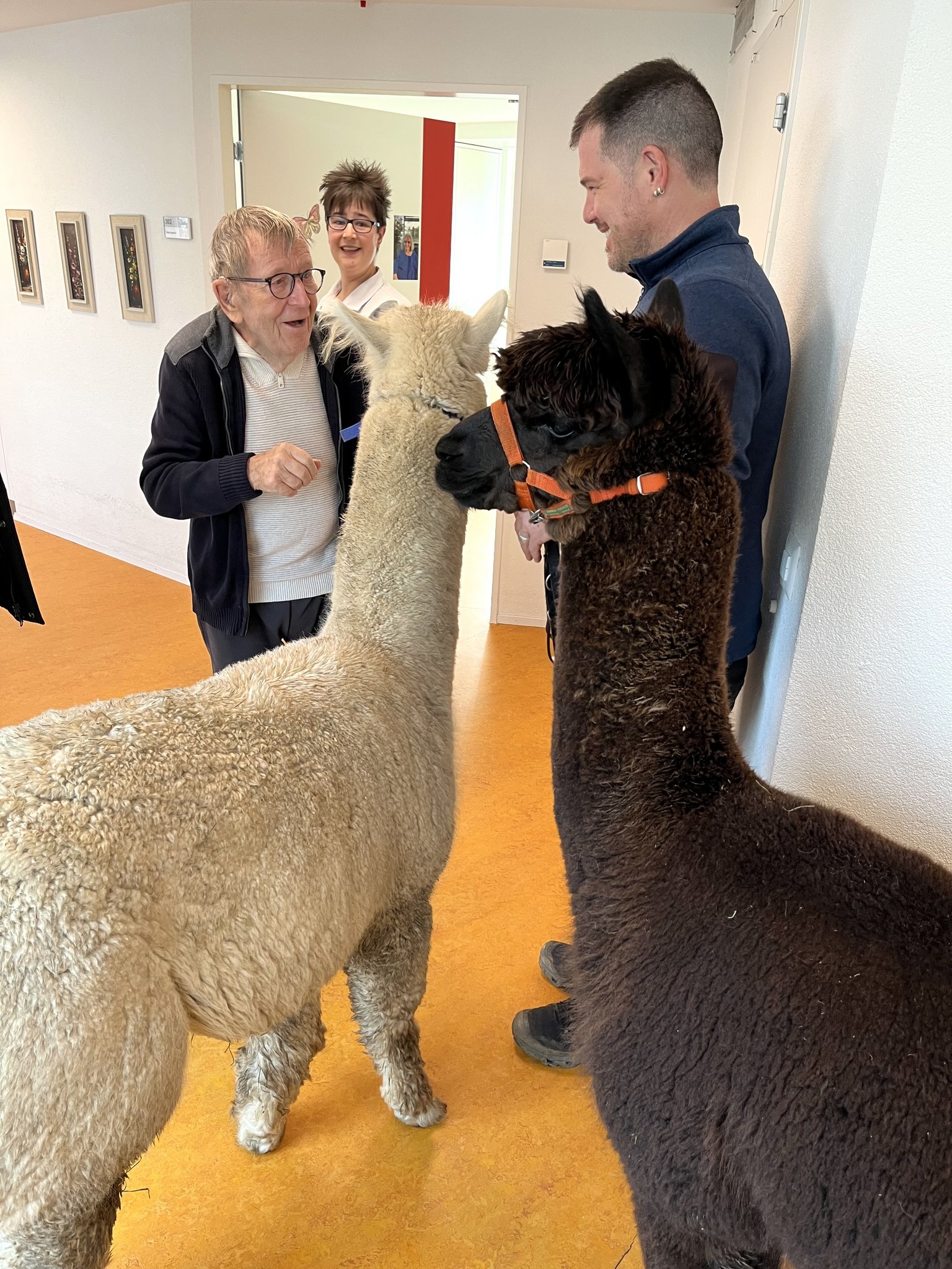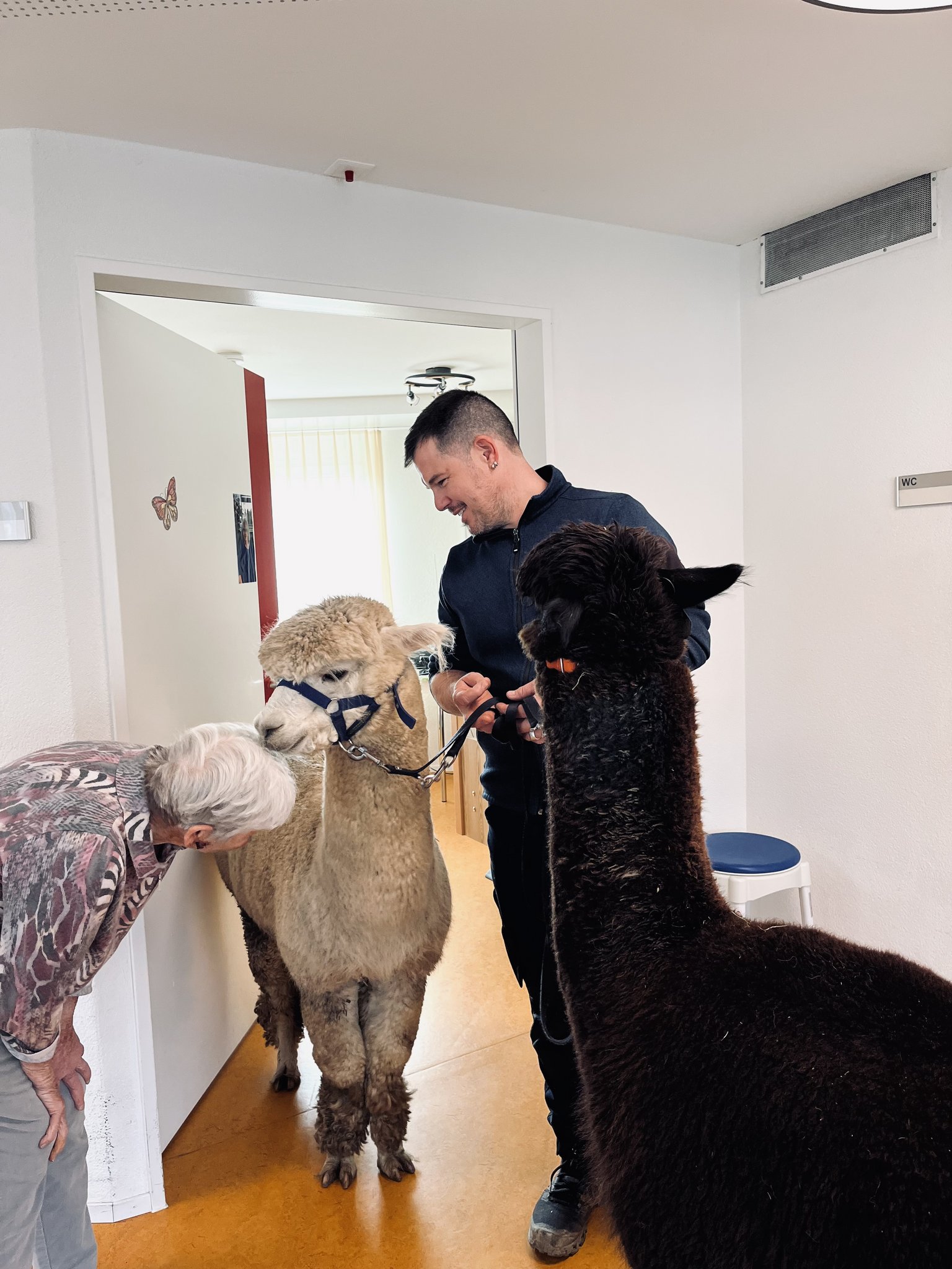 Am wichtigsten sei heute Nachmittag die Freude, sagt Thom Bernard. Und strahlt übers ganze Gesicht, während er die letzten Vorkehrungen für den nachmittäglichen Besuch auf der Demenzabteilung des Alterszentrums Schlossgut in Münsingen (BE) trifft. Hier hat der diplomierte Pflegefachmann als Stationsleiter gearbeitet, bevor er sich mit seinen Alpakas selbstständig machte. Aus den anfänglichen vier sind mittlerweile über 90 Tiere geworden. Eine stattliche Herde. «Es ist ein 7-mal-24 Stunden-Job», sagt der 45-Jährige, dem sein Partner in jeder freien Minute und ein Wochenende pro Monat zwei Aushilfskräfte bei der Versorgung der agilen Tiere zur Hand gehen, die an diesem sonnigen Nachmittag in der Berner Gemeinde Köniz an drei unterschiedlichen Standorten grasen.