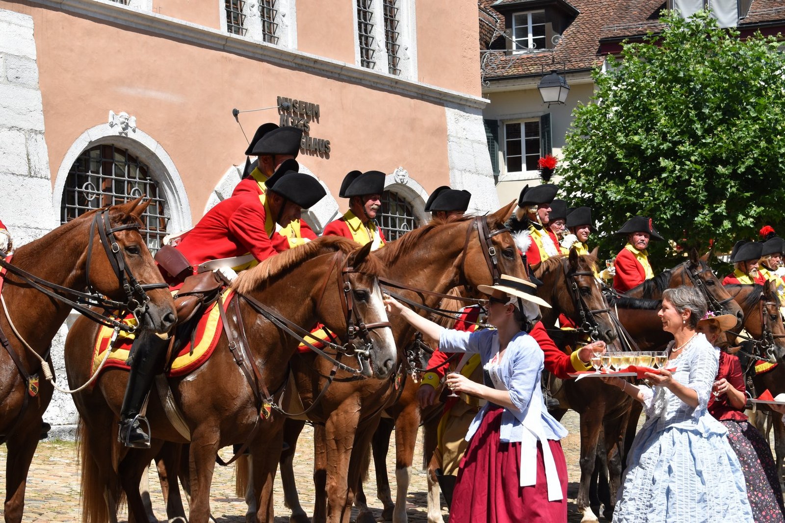 Bei Temperaturen über 30 Grad tragen sie eine rot-gelbe Paradeuniform, beige Hosen, hohe schwarze Stiefel und einen Dreispitz auf dem Kopf. Bei einigen blitzt eine graue Perücke darunter hervor, wie man sie vielleicht aus englischen Gerichten oder Filmen kennt. Auch die Schabracken und Mantelrollen auf dem Rücken ihrer Pferde sind in knalligem Gelb-Rot gehalten, den Farben des «alten Berns». Dies hat seinen Grund: Bei der Truppe handelt es sich um die Berner Dragoner 1779, die offizielle berittene…