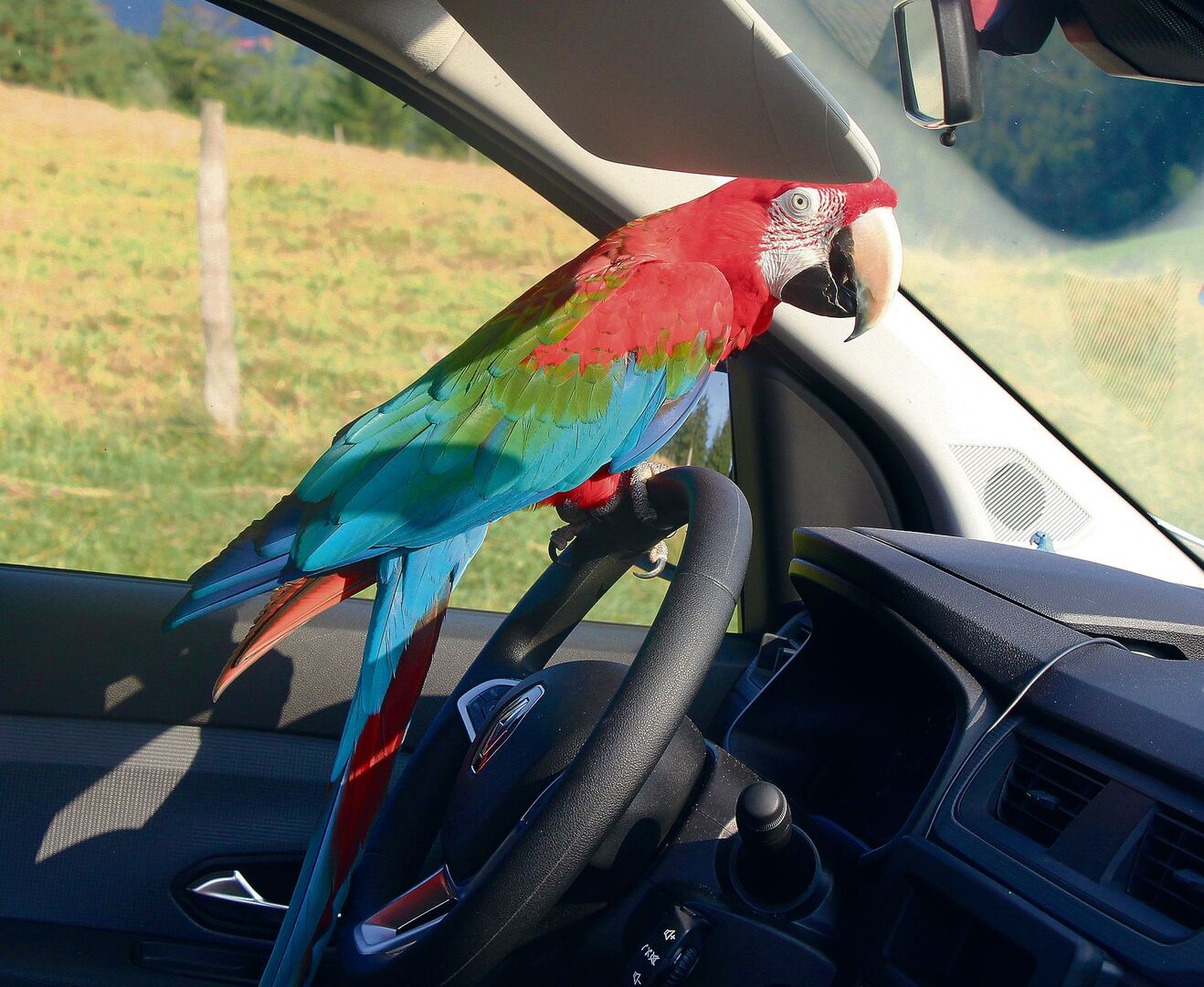 Nevada fliegt auf einen Zaunpfosten und schaut über das Hügelland des Juras. Sofort trotten Kühe heran. Kein Wunder, dass sie neugierig sind. Nevada ist keine Krähe, sondern ein südamerikanischer Dunkelroter Ara mit funkelnd roten, grünen und bläulichen Federn. Ein ungewöhnlicher Gast auf dem Zaunpfahl.