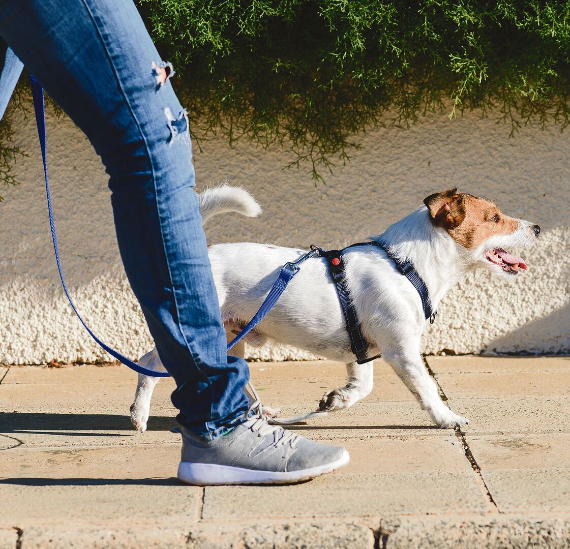 Mein oberstes Ausbildungsziel ist, dass ein Hund locker an der Leine läuft. Dann ist es in Prinzip auch egal, ob er ein Halsband oder ein Brustgeschirr trägt», sagt Helen Höfliger, die Leiterin der Hundeschule «Zu mir». Wenn aber schönes An-der-Leine-Laufen ohne Zug nicht möglich ist, dann sei ein Brustgeschirr die bessere Lösung. Einerseits, um Schmerzen oder gar gesundheitliche Schädigungen an der empfindlichen Halsregion zu vermeiden. Durch starken Zug am Halsband kann die Halsmuskulatur verspannt werden. Andererseits kann ein Halsband zu einer Leinenaggression führen. Diese kann entstehen, wenn ein Hund jeweils stark an der Leine zerrt, weil er einen anderen Hund sieht, und die dabei entstehenden Schmerzen mit der Hundebegegnung in Verbindung setzt. Ein Geschirr entlastet die Halsregion und verteilt den Druck breiter auf die Brustregion.