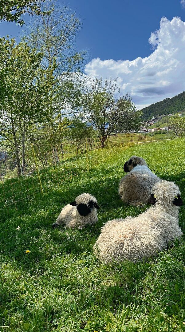 Schwarz umrandete Augen, schwarze Ohren und eine schwarze Ramsnase: Schon das Lämmchen hat die charakteristische Zeichnung der Walliser Schwarznasenschafe. Es gehört zur Herde von Fabienne Truffer und ihrem Partner René Schnyder. Fünfzig Muttertiere haben die beiden auf dem kleinen Biobetrieb in Erschmatt oberhalb von Leuk im Wallis. Das Lämmchen liegt im sattgrünen Gras bei seiner Mutter, drei weitere Auen und ihr Nachwuchs stehen gemeinsam auf der Weide beim Stall. Im Hintergrund sind die hohen Gipfel der Weisshorngruppe zu sehen. Idyllisch. Hier beim Stall ist der Kindergarten der «Ghornuti» – die «gehörnten Schafe» werden im Wallis liebevoll so genannt. Der Rest der Herde stehe momentan auf einer Weide im Nachbarsdorf, erzählt Fabienne Truffer.