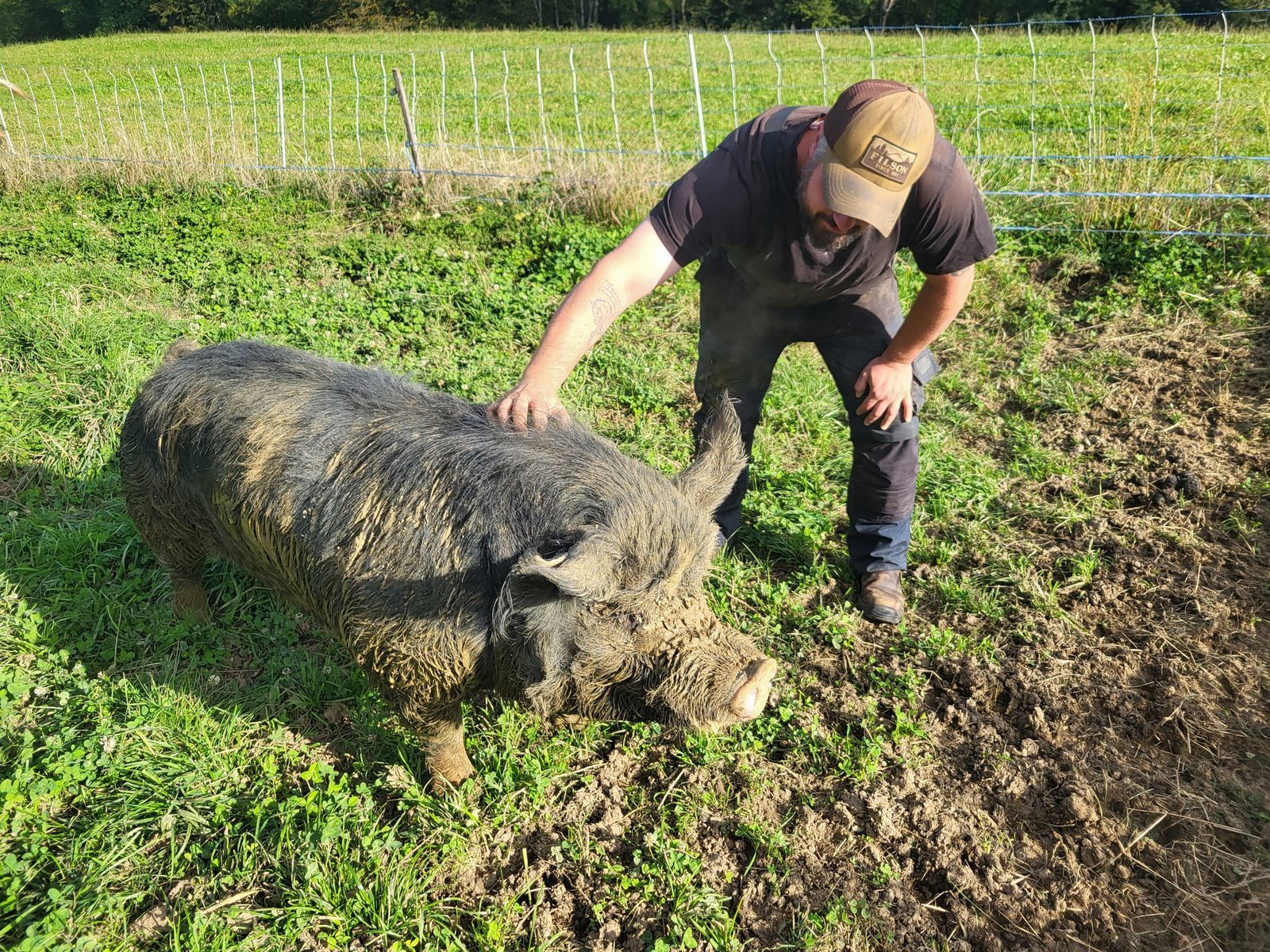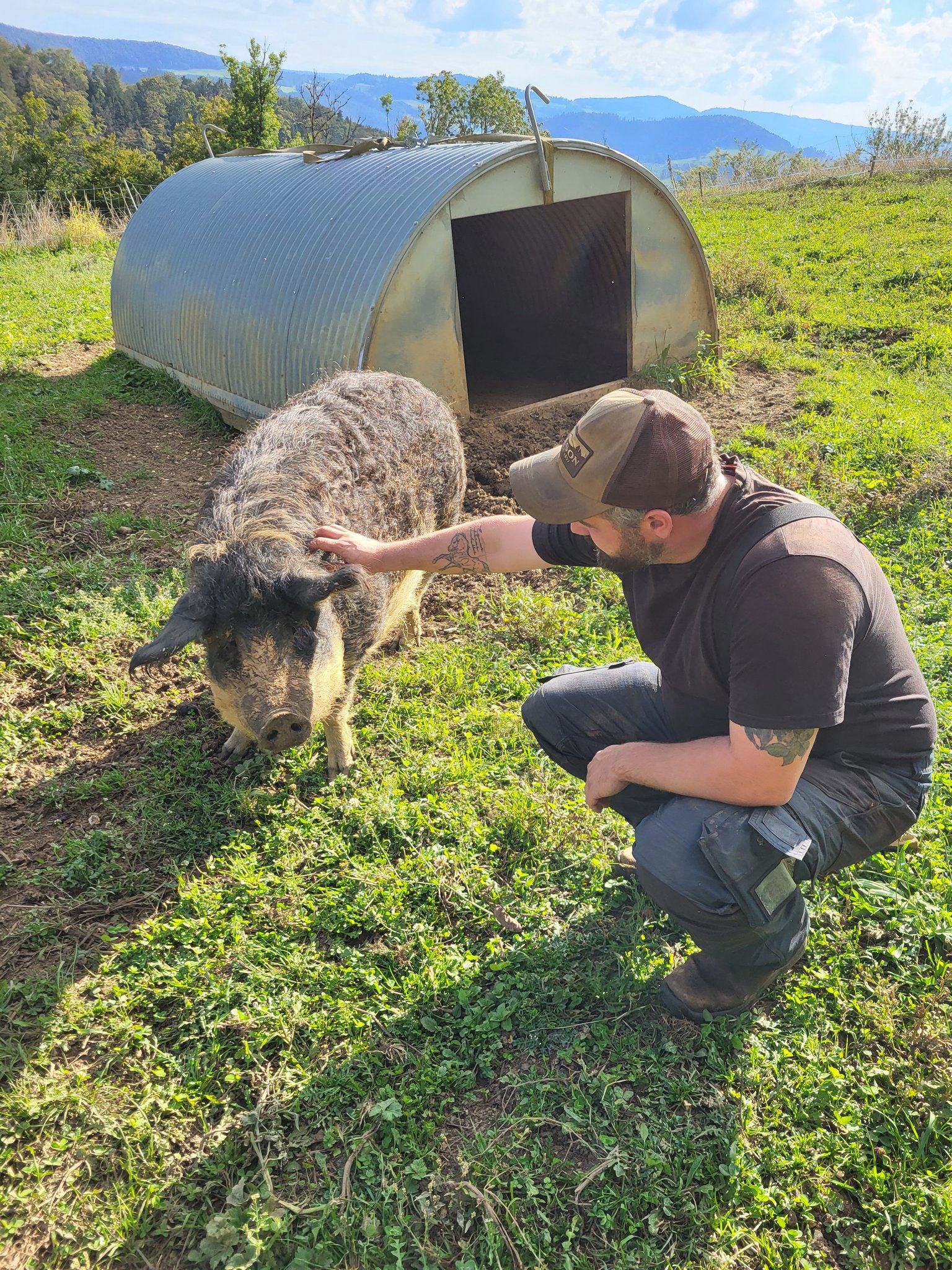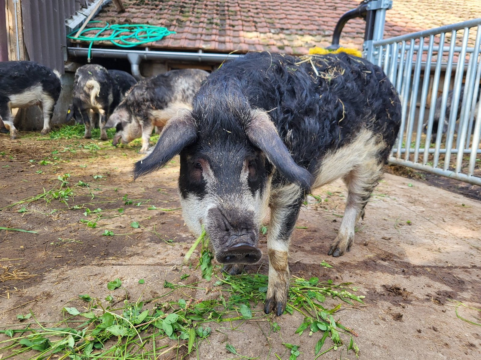 Um den extrovertierten und kontaktfreudigen Berkshire-Eber Harry herum hat Florian Schweer keine ruhige Minute. Kaum hört der Landwirt auf, die borstige Haut des Schweins zu kratzen, trampelt ihm der Eber fordernd hinterher. «Er schätzt den Kontakt und die Nähe», meint Schweer mit einem nachsichtigen Lächeln. Einen ganz anderen Charakter sei Harrys Zuchtpartnerin der Rasse Wollschwein. «Lisa ist sensibel und eher zurückhaltend», verrät Schweer. Er verspricht sich einiges von der Kreuzung der beiden Rassen. «Wir haben schon seit Jahren Wollschweine und sind zufrieden mit ihnen.» Das einzige Manko: Sie setzen viel Fett an, was nicht mehr so gefragt ist wie einst. «Die Leute wollen heute Magerfleisch», so Schweer. «Wir wünschen uns Schweine, die gleich robust, sozial und umgänglich sind wie das Wollschwein.» Allerdings müssen sie auch rentabel sein, da die Wollschweine etwas sehr langsam zunehmen, so der innovative Landwirt. Auch diesen Nachteil könnten die Berkshire-Schweine vielleicht…